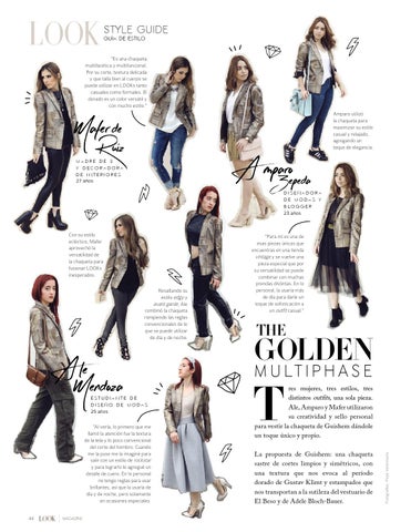 style guide guía de estilo “Es una chaqueta multifacética y multifuncional. Por su corte, textura delicada y que talla bien al cuerpo se puede utilizar en LOOKs tanto casuales como formales. El dorado es un color versátil y con mucho estilo.” Amparo utilizó la chaqueta para maximizar su estilo casual y relajado, agregando un toque de elegancia. Madre de 3 y Decoradora de Interiores 27 años Diseñadora de Modas y Blogger 23 años