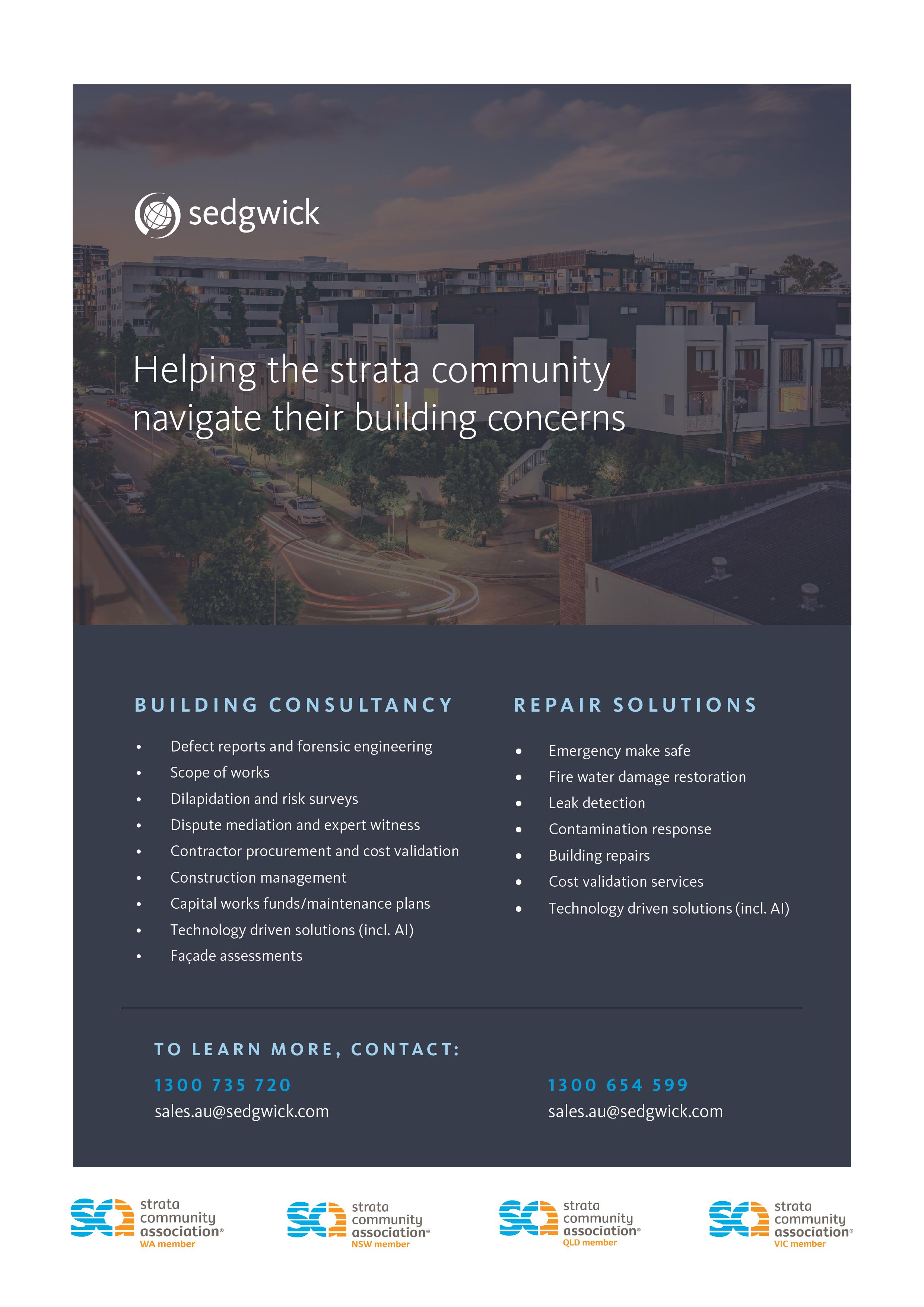 Disclaimer: The information contained in this magazine, including the response to submitted questions, is not legal advice and should not be relied upon as legal advice. You should seek independent advice before acting on the information contained in this magazine. Strata legislation is updated regularly. The information in this magazine is based on the legislation at the time of publishing.