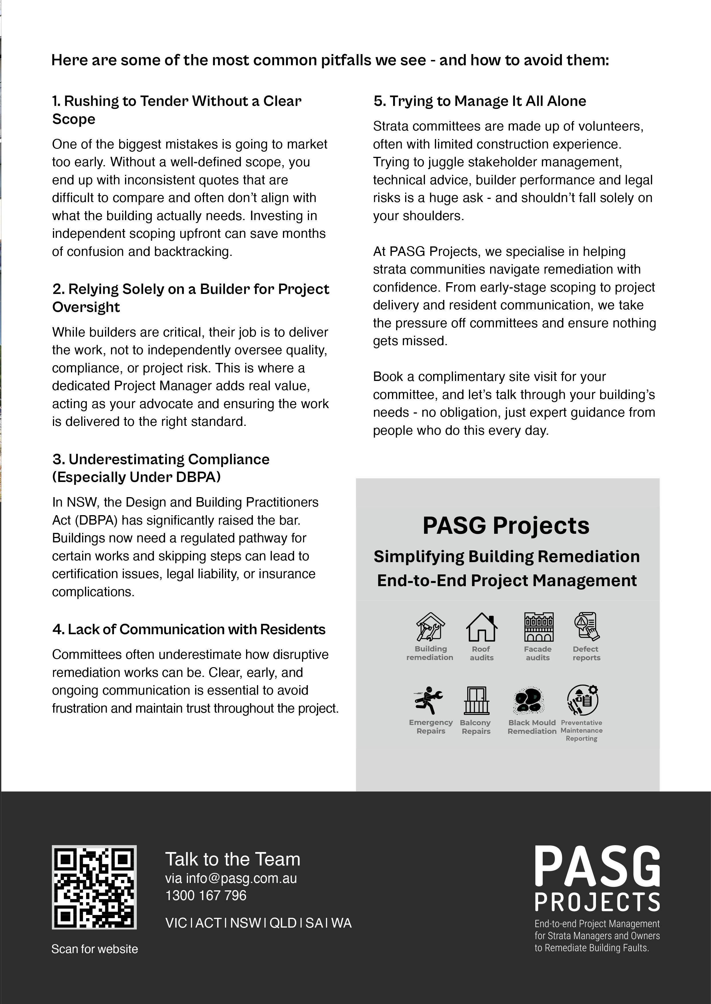 It is also highly recommended to engage an expert to assist with drafting the required scope of works and tender process. Your next steps should be calling a General meeting (if the strata committee refuse to deal with the matter) and pass the appropriate resolution to engage a suitably qualified expert to assist with inspecting the subject issue(s), carrying out any exploratory works where required and draft the necessary scope of works to be put out to tender for the consideration by the owners.
