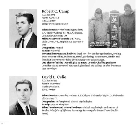 Education: four-year boarding student; B.A. Trinity College ’65; M.B.A. finance, Columbia University ’70 Military Service/Branch: U.S. Navy, Little Creek, Va., Amphibious Base 1966– Cindy and Bob Camp, 1968 Inca Trail, Peru 2006 Occupation: retired Family: widowed Personal interests and hobbies: local, not–for–profit organizations, cycling, cross–country skiing, swimming, travel, gardening, investments, family, and friends; I am currently doing chemotherapy for colon cancer. One piece of advice I would give to a new Loomis Chaffee graduate: Consider taking a year off between high school and college or after freshman year in college.