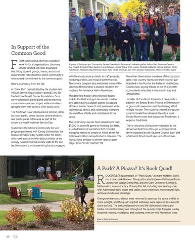 OCKEFELLER Quadrangle, or “Rock Quad,” as many students call it, has a new, park-like feel. The quad located between Katharine Brush Library, the Wilbur Dining Hall, and the Clark Center for Science & Mathematics received a face lift early this fall, including new seating areas with Adirondack-style chairs and tables, stone walkways, more natural light, and new shrubs and plantings. Overgrown trees and shrubs were removed to open up the space and let in more sunlight, and the quad’s asphalt walkways were replaced by a natural stone surface. The welcoming environs and the Adirondack chairs and tables outside the library and throughout the quad prompt frequent use by students relaxing, socializing, and studying, even on mild November days.