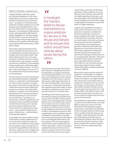 coequal chambers when they opted for a bicameral legislature. Laws in the United States, by contrast, require that a bill obtain majorities not once, but four times — passage first in both the House and Senate and then adoption of a revised measure in each chamber before it can go to the White House for the president’s signature. Lawmaking inevitably appears arcane and unprincipled, affirming the image of legislation as “making sausage.” Paradoxically, the unusual structure of the U.S. Congress discourages legislative ambitions in its members while demanding exceptional skill and tenacity to effect policy change. The framers expected that future lawmakers would be men of character and accomplishment much like themselves to manage such an unwieldy system. They held no illusions that all, or even most, lawmakers would be statesmen, but they anticipated that each Congress, as Madison asserted, would have “a few members of long standing who will be thoroughly masters of the public business.” In one respect, their expectations were correct: A few members have had an outsize impact on the institution. Yet shrewd observers of the United States have identified the absence of qualified leaders as a major flaw in both the legislative and executive branches. Traveling the country in the 1830s, Tocqueville concluded that Americans lack ambition for greatness as a nation, the result of their tendency “to eagerly covet small objects,” their disinterest in “lasting monuments,” and their propensity to “care more for success than fame.” Lord Bryce, six decades later, ended his magisterial work noting that American politics had fallen “into the hands of mean men” and that the nation’s greatest deficiencies had “least to do with constitutional arrangements … [but resulted from] the prominence of inferior men … and the absence of distinguished figures.” In hindsight, the framers failed to devise mechanisms to inspire ambition for service in the House and Senate and to ensure that voters would have choices about issues facing the nation. Instead, they allocated the responsibility for elections to the states, which gave rise to fragmented, anti-competitive parties heavily depen-