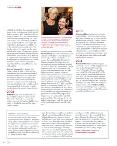 midfield, faced off for the national title. The teams, titans in the lacrosse world, battled for four quarters, with Virginia coming out on top in the end, 9–7. This is the Cavaliers’ fourth national championship, and Maryland has two to its name. Drew, a redshirt junior at Maryland, was a key midfielder for the Terps during their incredible run to the national championship game. The Fairfax Station, Va., native was the team’s sixth-leading scorer (17 goals and 3 assists) and was a team leader on the first offensive midfield unit for the season. Matt, a junior at Virginia, was a mainstay in the midfield during Virginia’s resurgence in the second half of the season. Drew’s father, Kris, played for the University of Virginia from 1974 to 1978. Rebecca Wentworth graduated from Union College on June 12, 2011, with a bachelor of science degree in mechanical engineering and minors in Chinese and mathematics. She was a four-year member of the women’s crew team and was awarded an honor for service leadership and outreach. She traveled to Ethiopia last summer as a Davis Projects for Peace fellow, implementing a water system in Boru.