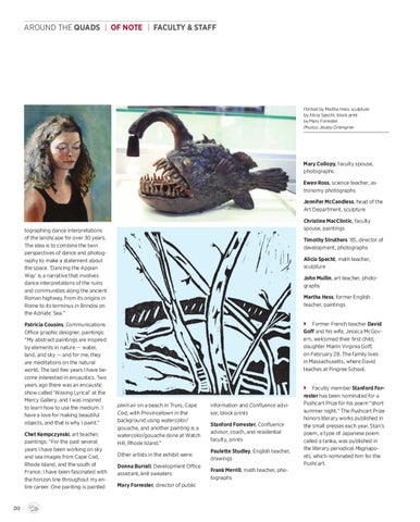 Timothy Struthers ’85, director of development, photographs Alicia Specht, math teacher, sculpture John Mullin, art teacher, photographs Martha Hess, former English teacher, paintings