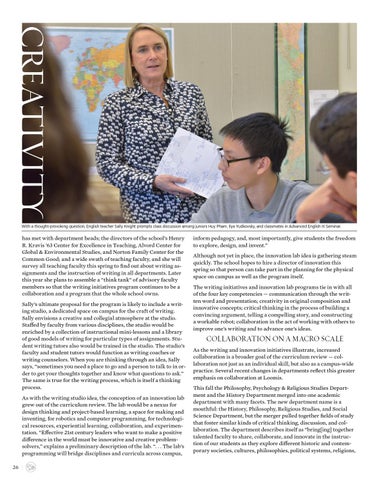 has met with department heads; the directors of the school’s Henry R. Kravis ’63 Center for Excellence in Teaching, Alvord Center for Global & Environmental Studies, and Norton Family Center for the Common Good; and a wide swath of teaching faculty, and she will survey all teaching faculty this spring to find out about writing assignments and the instruction of writing in all departments. Later this year she plans to assemble a “think tank” of advisory faculty members so that the writing initiatives program continues to be a collaboration and a program that the whole school owns. Sally’s ultimate proposal for the program is likely to include a writing studio, a dedicated space on campus for the craft of writing. Sally envisions a creative and collegial atmosphere at the studio. Staffed by faculty from various disciplines, the studio would be enriched by a collection of instructional mini-lessons and a library of good models of writing for particular types of assignments. Student writing tutors also would be trained in the studio. The studio’s faculty and student tutors would function as writing coaches or writing counselors. When you are thinking through an idea, Sally says, “sometimes you need a place to go and a person to talk to in order to get your thoughts together and know what questions to ask.” The same is true for the writing process, which is itself a thinking process. As with the writing studio idea, the conception of an innovation lab grew out of the curriculum review. The lab would be a nexus for design thinking and project-based learning, a space for making and inventing, for robotics and computer programming, for technological resources, experiential learning, collaboration, and experimentation. “Effective 21st century leaders who want to make a positive difference in the world must be innovative and creative problemsolvers,” explains a preliminary description of the lab. “. . . The lab’s programming will bridge disciplines and curricula across campus, 26 |