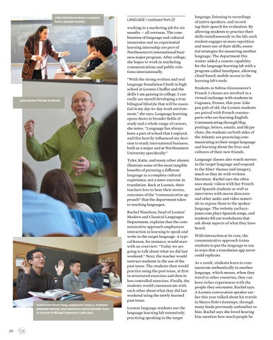language, listening to recordings of native speakers, and recording their speech for evaluation. By allowing students to practice their skills simultaneously in the lab, each student engages in more repetition and more use of their skills, essential strategies for mastering another language. The department this winter added a remote capability for the language learning lab with a program called SansSpace, allowing cloud-based, mobile access to the learning lab’s tools. Students in Sabine Giannamore’s French 3 classes are involved in a virtual exchange with students in Cugnaux, France, this year. Like pen pals of old, the Loomis students are paired with French counterparts who are learning English. Communicating through blog postings, letters, emails, and Skype chats, the students on both sides of the Atlantic are practicing communicating in their target language and learning about the lives and cultures of their new friends. Language classes also watch movies in the target language and respond to the films’ themes and imagery, much as they do with written literature. Rachel says she often uses music videos with her French and Spanish students as well as interviews with movie directors and other audio and video materials to expose them to the spoken language. The website zacharyjones.com plays Spanish songs, and students fill out worksheets that ask about aspects of what they have heard. With interaction at its core, the communicative approach trains students to put the language to use in ways that a translation app never could replicate. As a result, students learn to communicate authentically in another language, which means, when they travel to other countries, they can have richer experiences with the people they encounter, Rachel says. A Loomis convocation speaker earlier this year talked about his travels in Marco Polo’s footsteps, through many lands previously unfamiliar to him. Rachel says she loved hearing him mention how much people he
