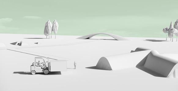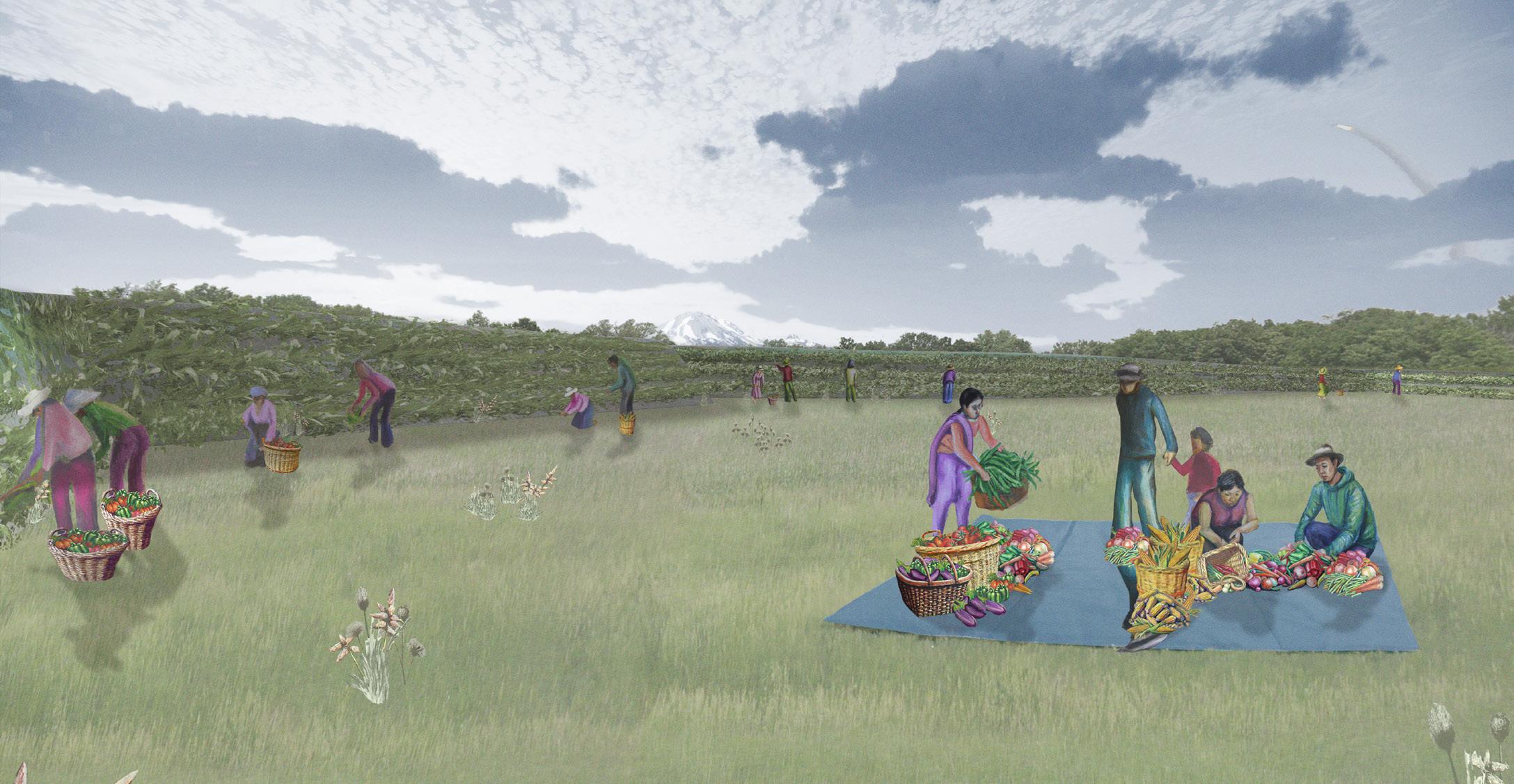 The Growth scenario approaches monumentality through the lens of individual contribution and impressions of life. The narrative begins during a period of growth in the United States, where the country shifts to becoming the definitive global exporter, becoming reliant on migrant workers. In a newly formed worker’s town in the Great Plains, a group of artists built a monument to serve as a community garden and experiment (1). This structure is a series of high-density fertilizer blocks encased in local soil. Users can plant along the terraced edges and expand it through the molds located on site. This monument encloses and defines spaces through its form, allowing the residents to define its purpose and what grows within it. Additionally, the site is a mixing pot where people grow food, educate, and share local and international plant varieties (2).