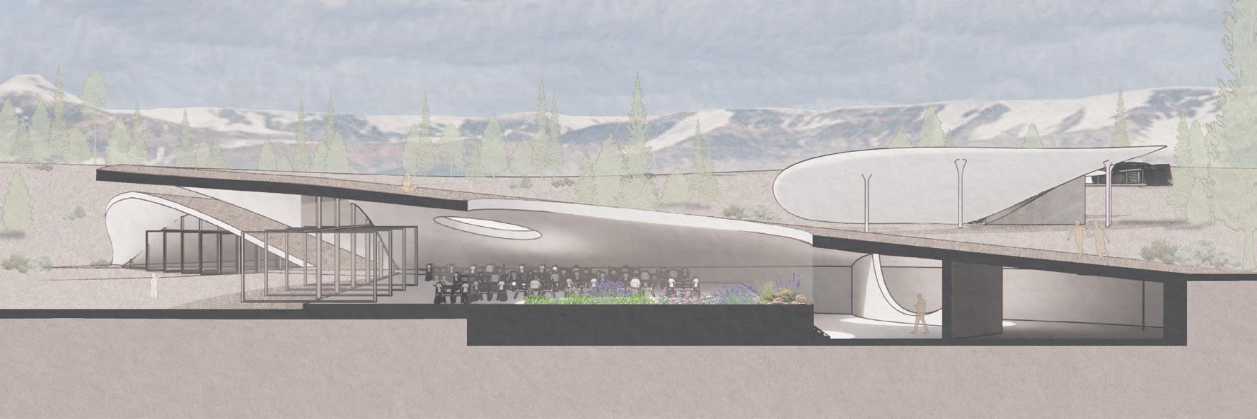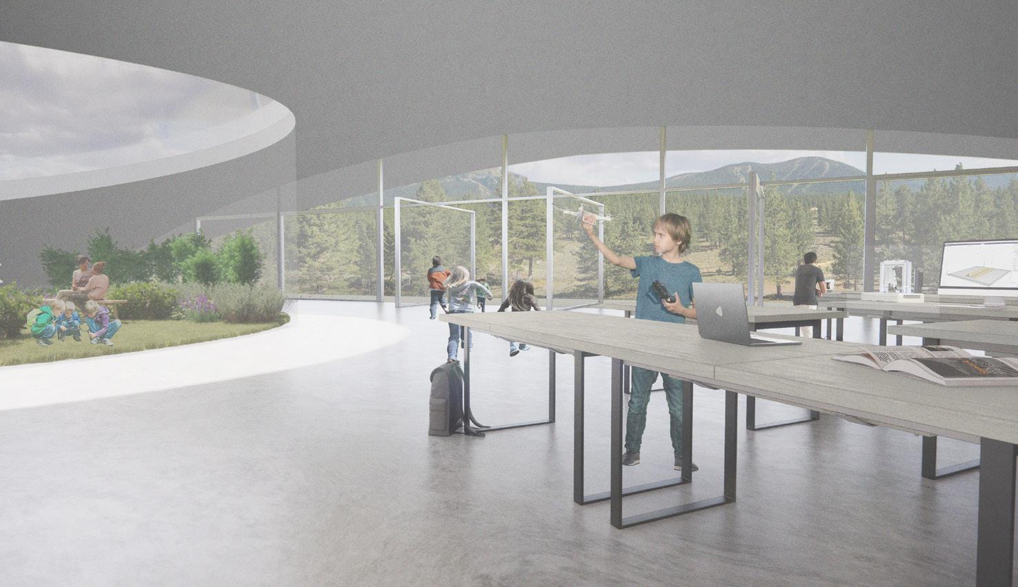 This reshaping of the educational pedagogy aligns with the architectural approach of minimally invasive, dispersed, flexible, and naturally based architecture. Spaces such as Cafe Hill are designed to resemble hills when approached from the rear. However, as students approach the front, they are welcomed by an open facade that provides views of the landscape and connects the interior and exterior of the spaces. The cafe space provides a place to socialize and learn while the maker space lets students work with their hands, build skills, and learn about cutting-edge technologies.