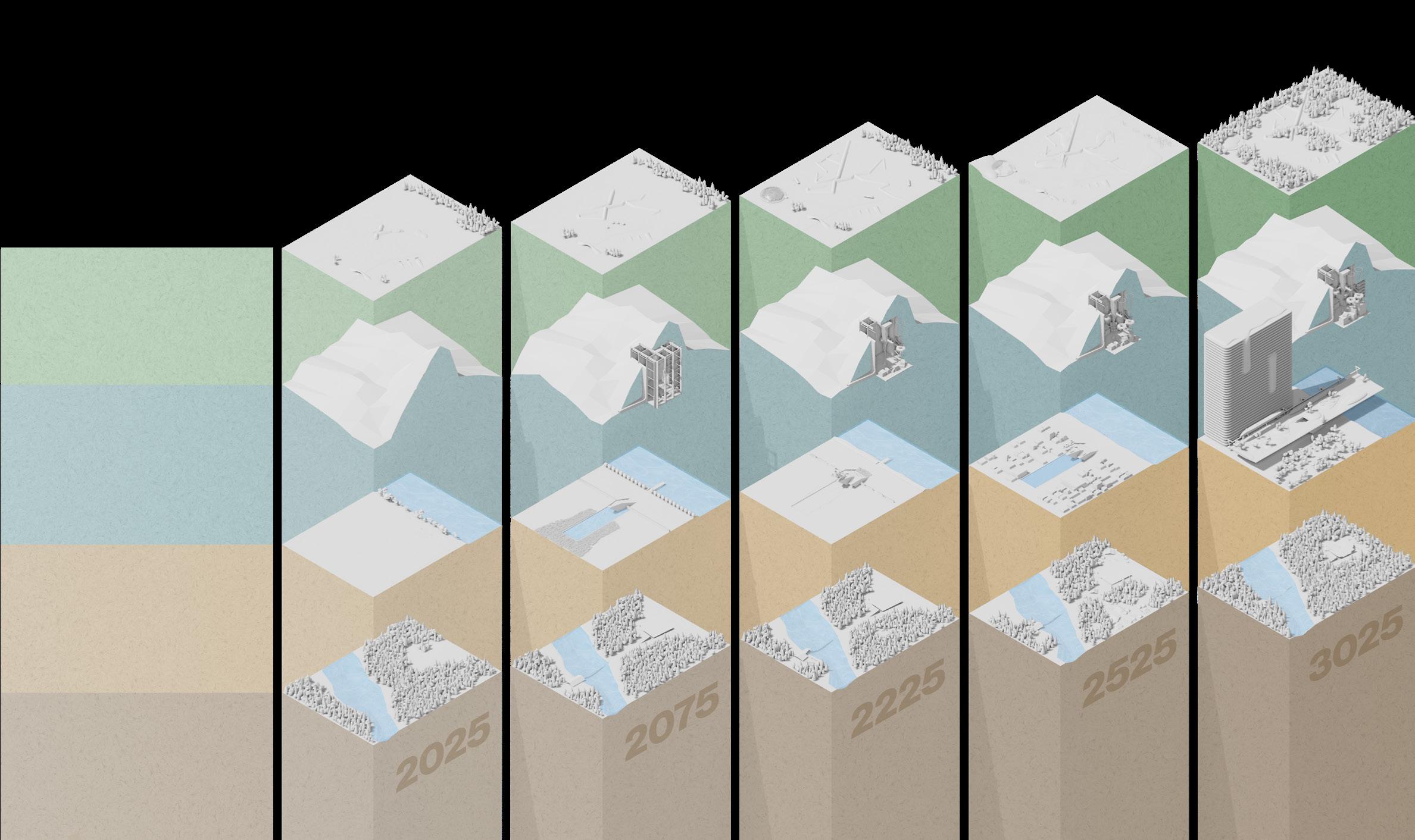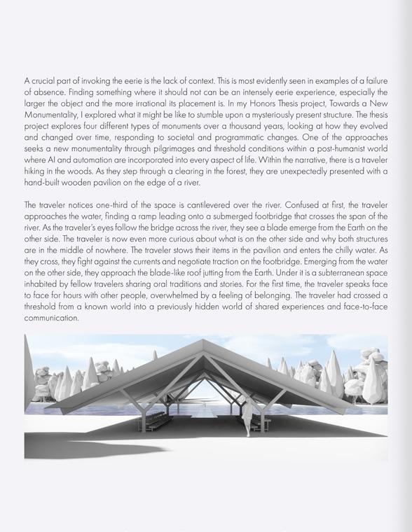 From this understanding, a set of modifications to monumentality are proposed and tested through four speculative future scenarios spanning a millennium. The four narratives begin with an inciting archetype of either Growth, Decline, Discipline, or Transform. Across the timeline, events corresponding to different archetypes occur, allowing for each timeline to move through all four archetypes. A monument is designed at the beginning of each narrative, and as events occur and populations change, the monument’s design, purpose, and importance evolve. Each narrative features five events ranging between one and two pages of narrative text and a 3D model of the monument and the events described within the narrative. Through this design and narrative exercise, a series of conclusions emerge across all the narratives, with these points forming the backbone for constructing monuments and megastructures of the present, future, and future-past.