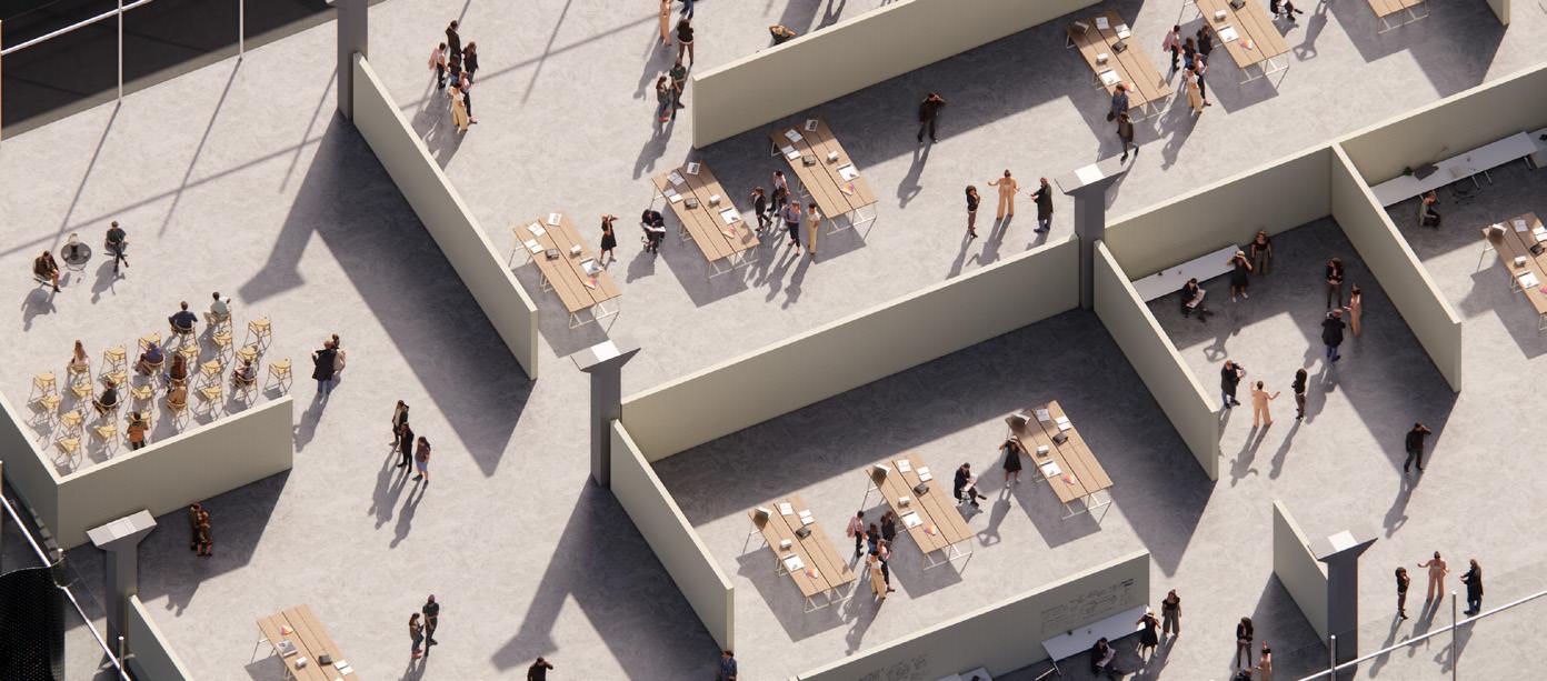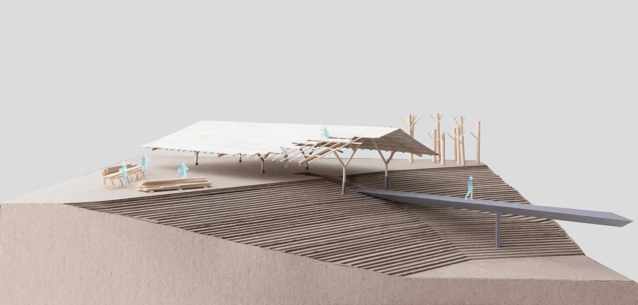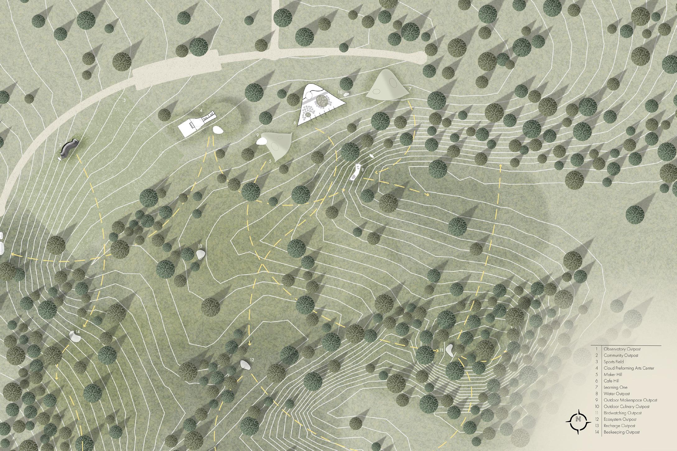 While a group project, all graphics, pedagogy concepts, and the design of Cafe and Maker Hill were done by Avery Moric, group contributions include site organization and the completion of other buildings on the campus not shown here.