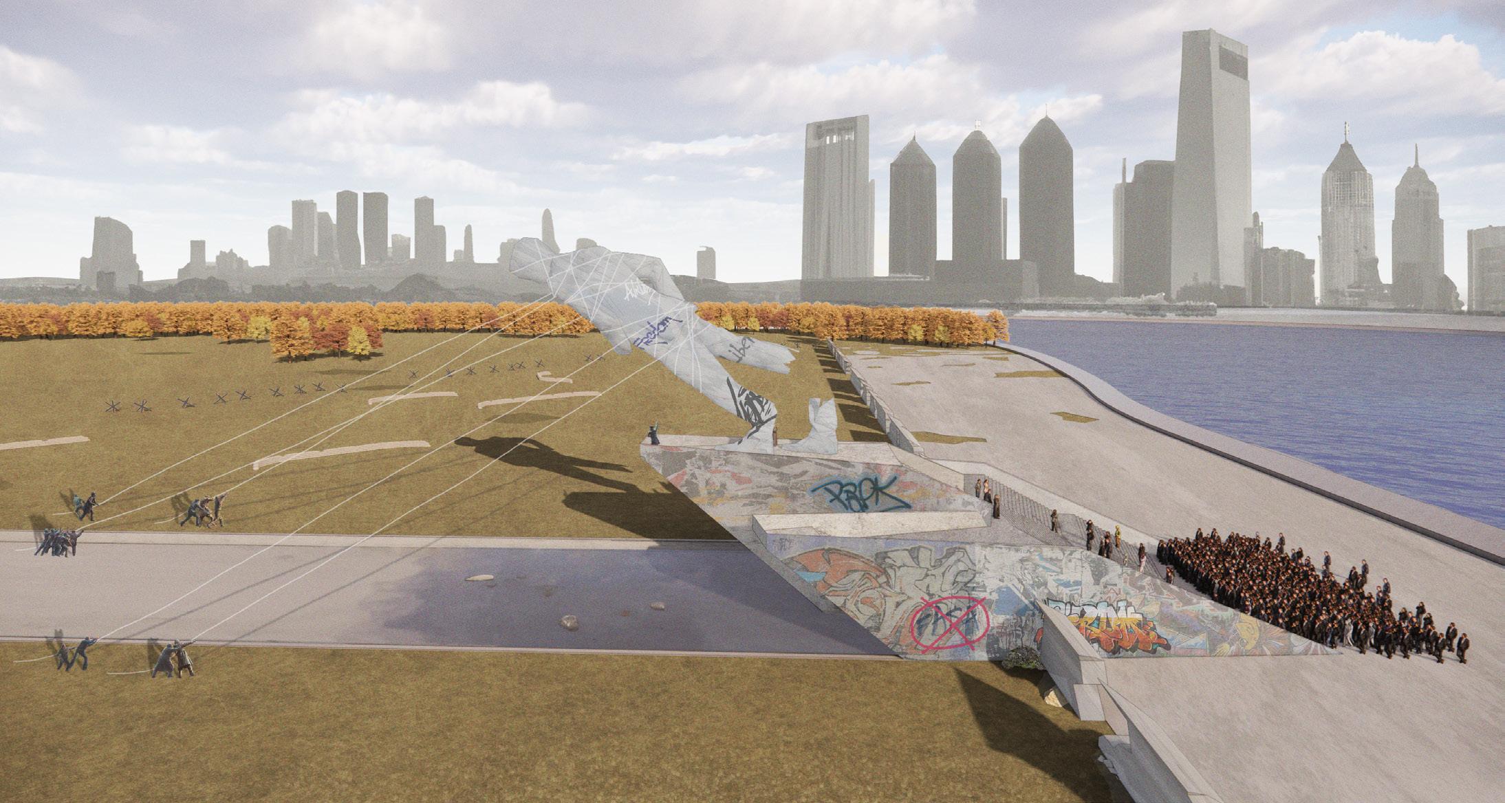 The Discipline approach is unique among the other approaches as it follows the story of how a monument of old can evolve into an example of new monumentality through different appropriations. The monument begins with a specific program and message, but as time progresses, its true purpose is revealed, that of being a vessel for a wide-ranging swath of ideas and emotions reflective of the people around it. The site is Butler Park along the Colorado River in Austin, Texas, where terror and crime become the most pressing issue in the election of 2064, where President 58 is elected on an extreme anti-terror message. The President’s policies translate to free speech, thought, and movement restrictions. Protests break out at Butler Park and are violently put down; the President orders the construction of a speaking platform to occupy and desecrate the space. This plaza for speech has been perverted to a plaza of propaganda (1). As time passes, additional speaking podiums and a statue of the President are constructed. By the year 2225, the nation is fractured into walled controlled cities and wild free states. The free states grow more extensive and wealthy and begin to make efforts to dismantle the restrictive federal state. Freedom Fighters tear down the statue in the park and co-opt the plaza to unify people (2). At the end of a lengthy and costly war, peace is made between the free and federal states; this peace declaration is signed at the monument, turning a space of incitement into a space of reconciliation. Five hundred years after this peace, the two cities of Austin are connected and prosperous once again. To commemorate this bond, the monument is used to construct a multipurpose pedestrian and transit walkway across the river (3). Monuments of the future should be designed to facilitate expansion, change of purpose, change of audience, and evolution of programs to be valuable and relevant to future generations. The space should provide a forum for each generation to adapt and build their narratives upon. This is evident in how the space and structure are pulled back and forth between freedom and oppression by different generations. The conflict the monument has witnessed is monumental in itself, as the graffiti, damage, and additions tell a story far more powerful than a static or removed monument (4).