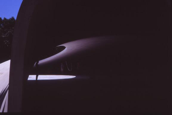 The journey to Teshima can be described as a pilgrimage of sorts. To reach the island of Teshima one must embark on a day’s long journey across Japan traveling on trains, ferries, and cars towards the Inland Sea of Japan. This only brings one to the harbor on the island; a further trek by foot or by bicycle is required to get to the museum itself. As one gets closer to the site the surrounding hills begin to tease the traveler by revealing glimpses of the museum’s stark white form amongst the trees. The hills eventually give way to the museum itself, revealing a large organic dome with a pair of complementary elliptical openings. Mirroring these openings the museum itself is paired with another more modest dome that serves as a cafe and shop adjacent to it.
