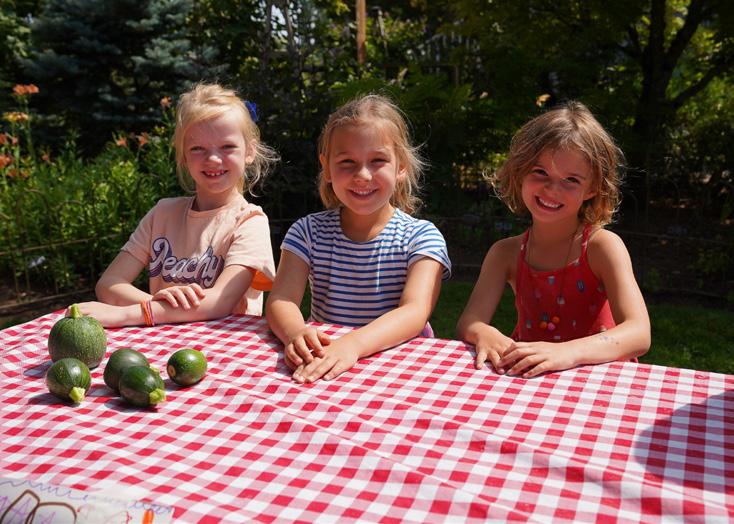 Children sing songs, play games, listen to stories, and create arts and crafts in an outdoor setting.