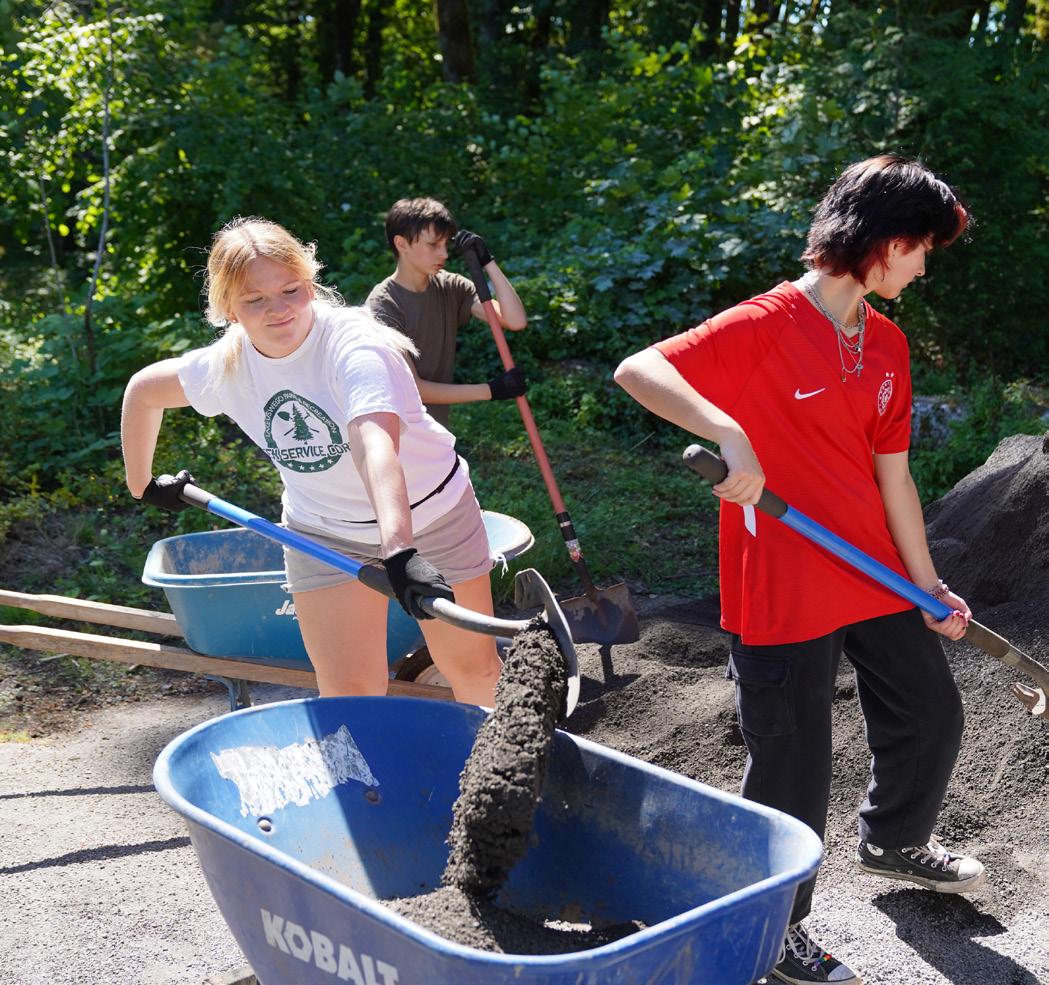 58 LOHS Cross Country runners spread gravel on trails in Springbrook Park