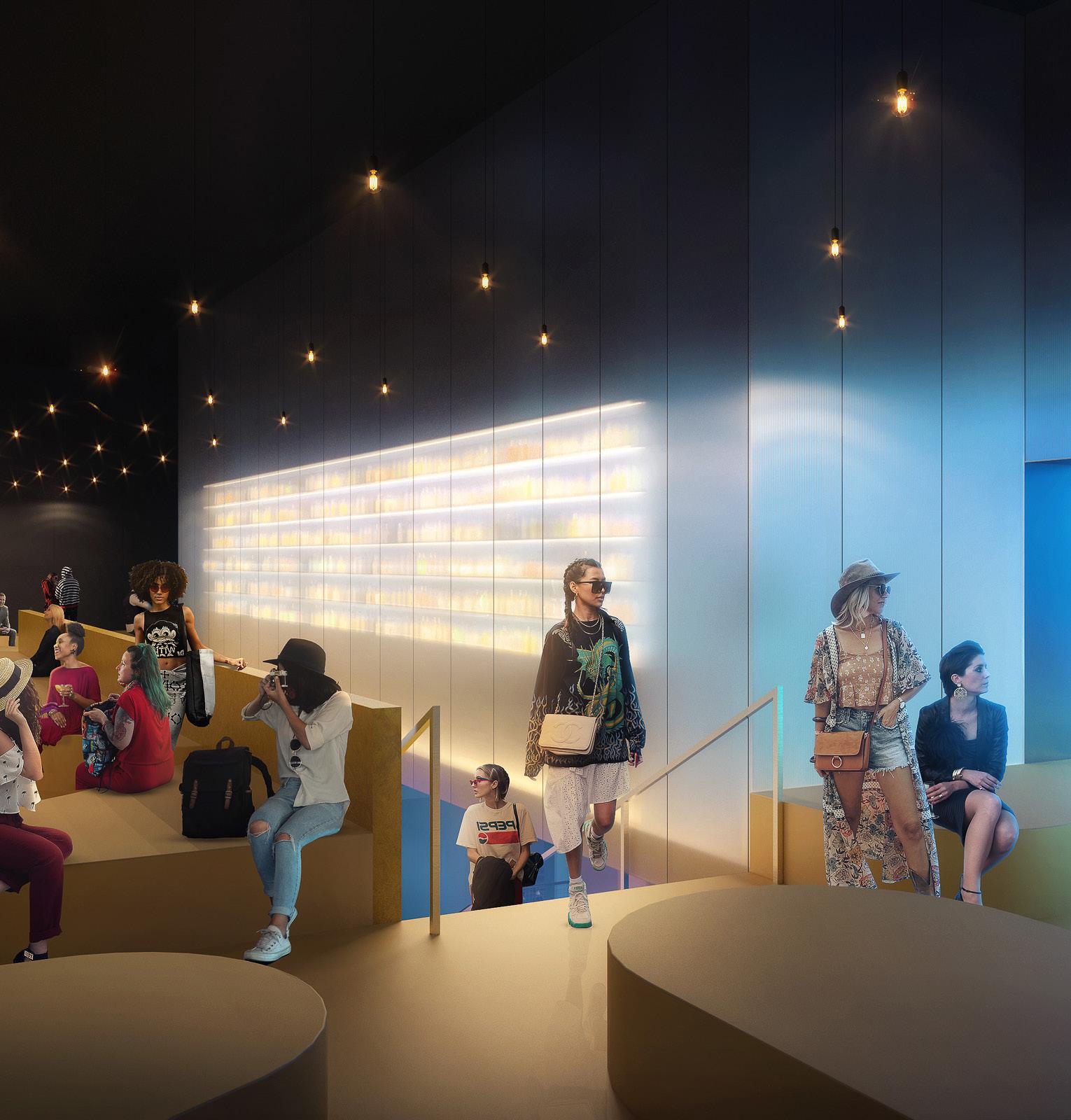 Dentro del lugar, una serie de espacios que conducen a la presentación principal están definidos por materiales industriales y efectos de iluminación efímeros.