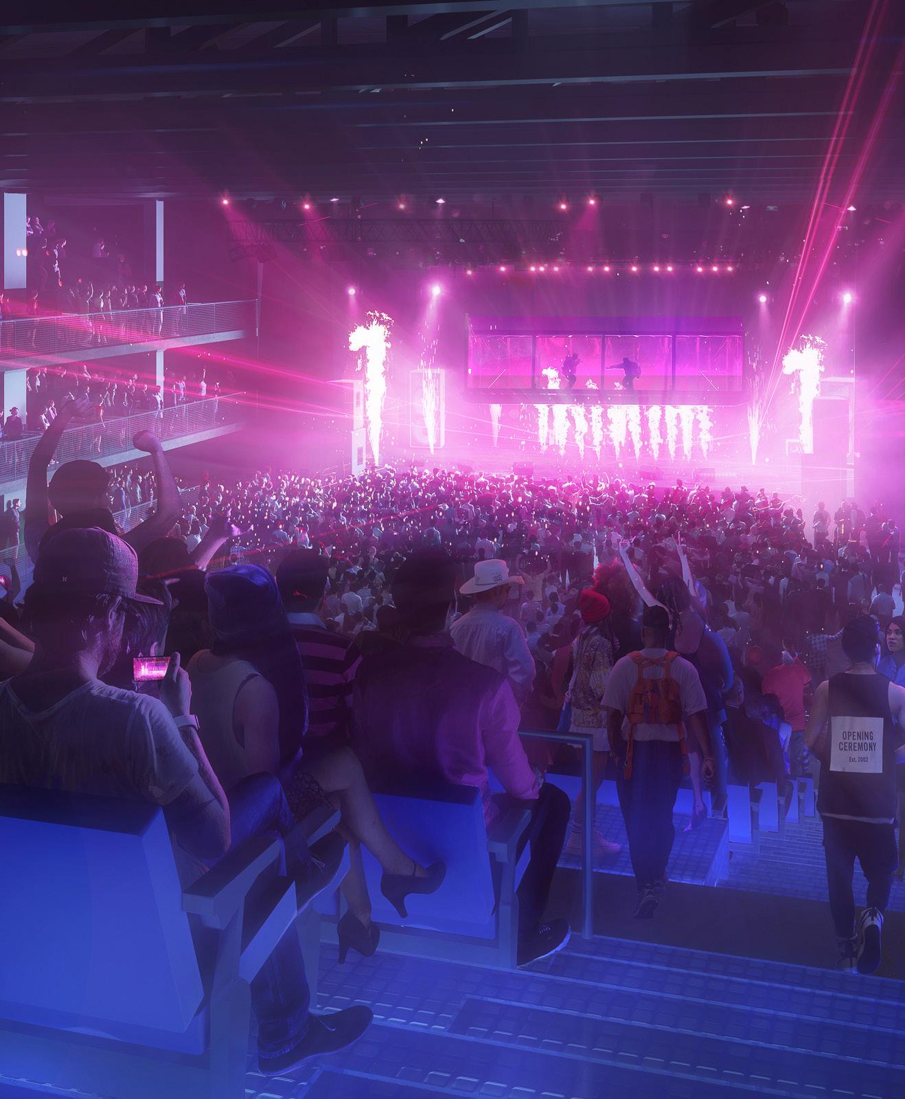 Grandes rampas fluyen desde la calle hasta una “topografía accesible de actuaciones” en el segundo nivel, conectando los espacios de actuación al aire libre y bajo techo, incluida la sala de conciertos entre torres y el teatro ppal.