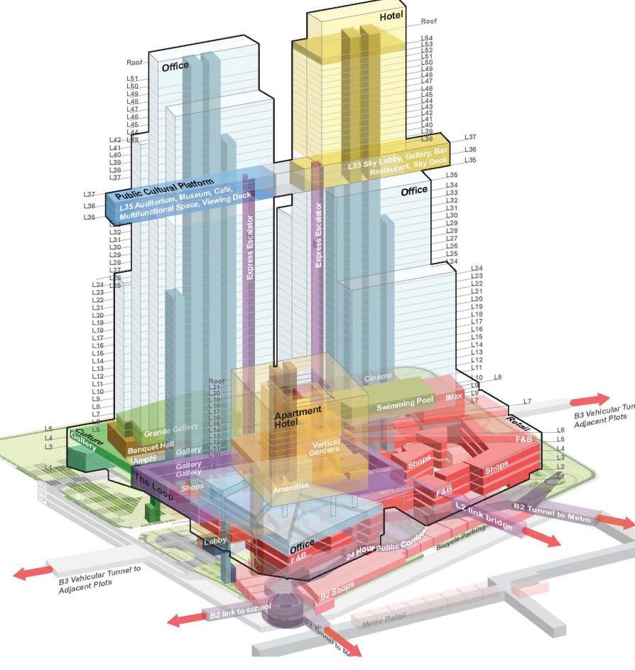 El desarrollo de gran altura ha sido diseñado como una colección de volúmenes esbeltos, cayendo en cascada desde el centro y formando dos torres principales. Las partes más altas de las torres, y un puente aéreo que las conecta, le darán al edificio una fuerte direccionalidad, apuntando hacia la bahía de Qianhai y las montañas de Nanshan. Los volúmenes más bajos de las torres principales responderán a la escala urbana de su entorno inmediato, incluido el Corredor de la Ruta de la Seda, un importante parque público de la zona. Un edificio en forma de cubo flotará sobre el podio para formar una conexión visual entre el complejo de edificios y el Corredor de la Ruta de la Seda.