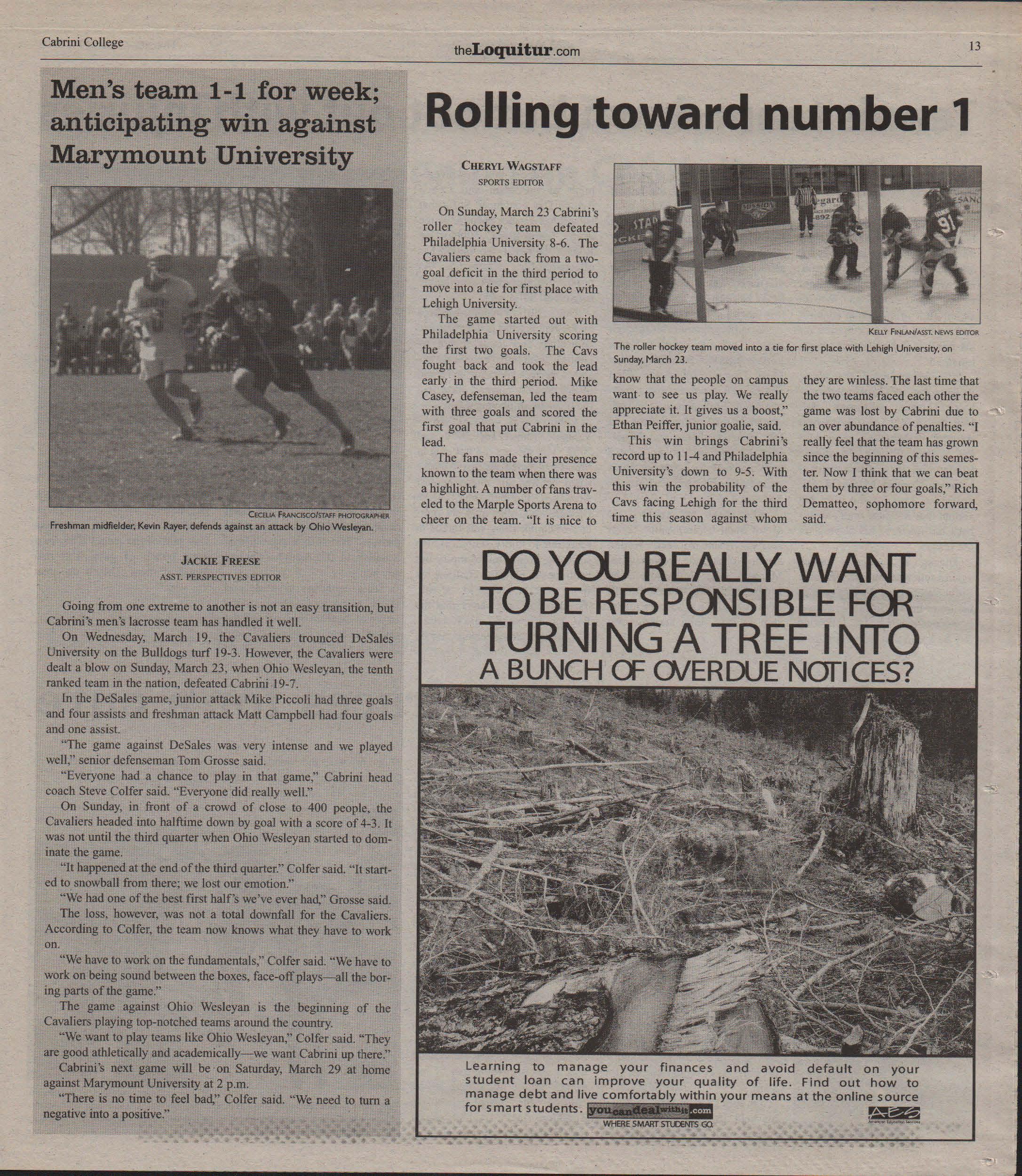 On Wednesday, March 19. the Cavaliers trounced DeSales University on the Bulldogs turf 19-3. However, the Cavaliers were dealt ablow on Sunday, March 23, when Ohio Wesleyan, the tenth ranked team in the nation, defeated Cabrini 19-7.