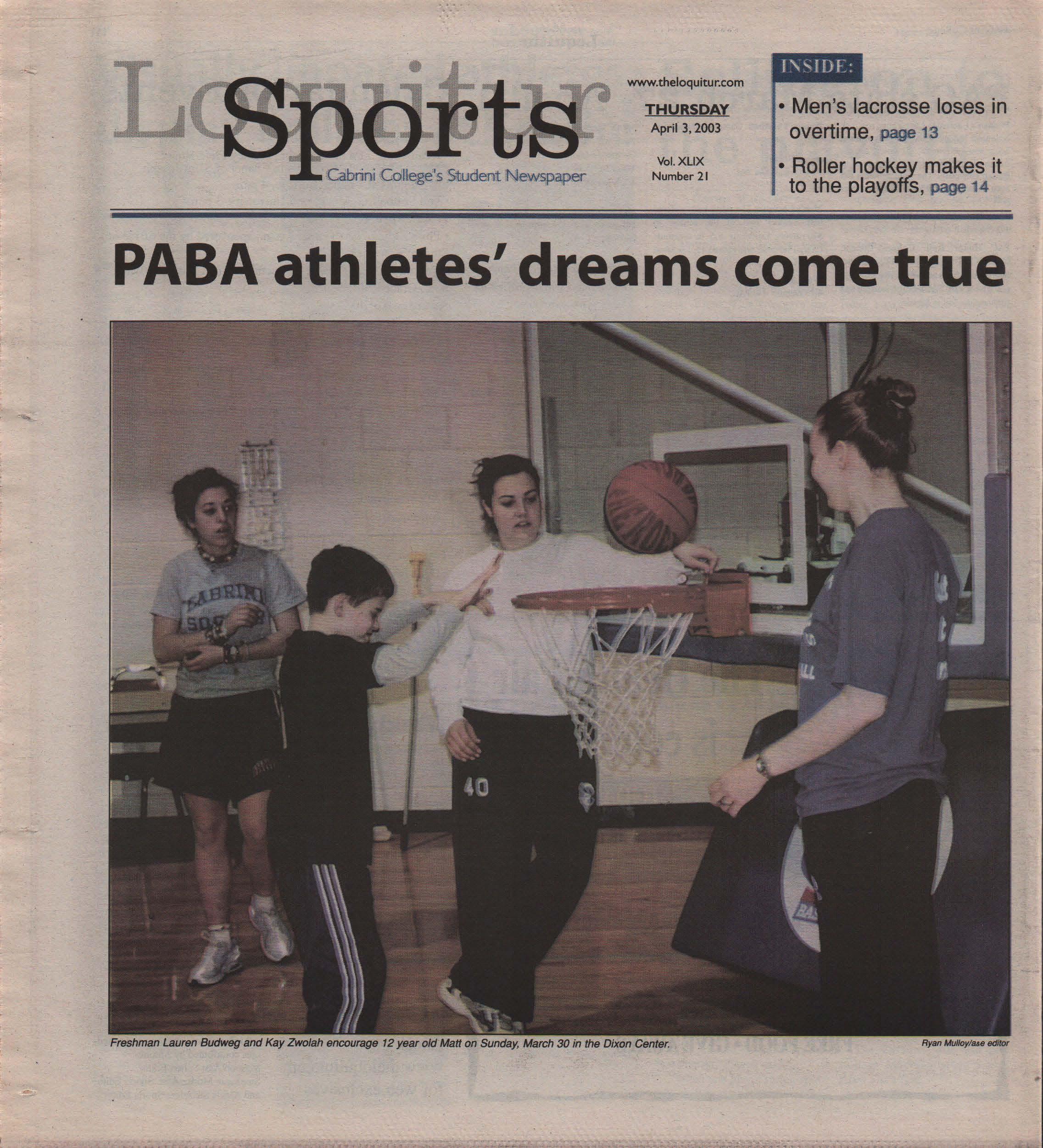 • gjt~s~ Cabrini College's Student Newspaper www.theloquitur.com THURSDAY April 3, 2003 Vol.XLIX Number 21 I ):\SIDE: • Men's lacrosse loses in overtime, page 13 • Roller hockey makes it to the playoffs, page 14 PABAathletes' dreams come true