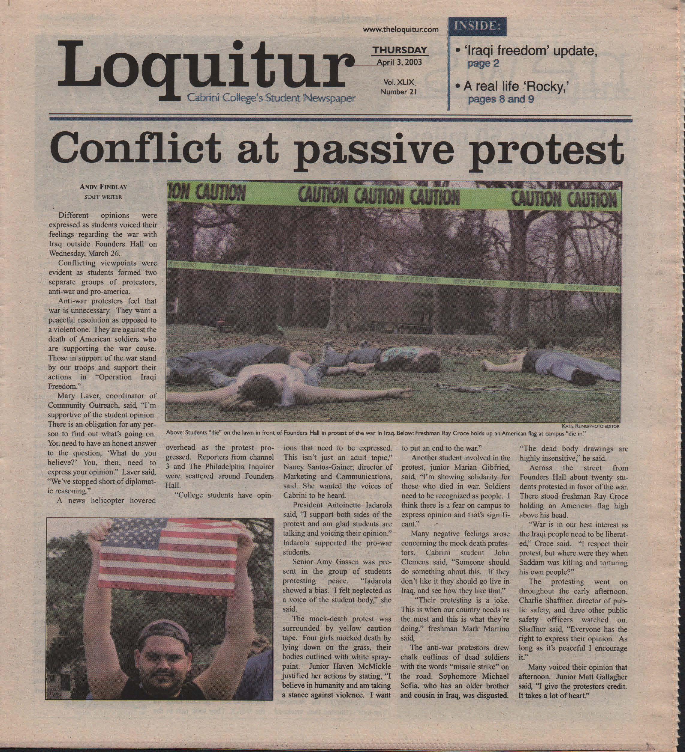 Many negative feelings ·arose concerning the mock death protestors. Cabrini student John Clemens said, "Someone should do something about this. If they don't like it they should go live in Iraq, and see how they like that."
