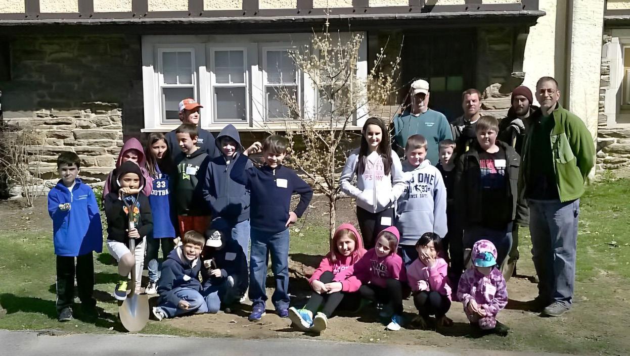 “Take your kid to work day” activities, including planting a tree near Grace Hall. Brooke is front row center, in pink.