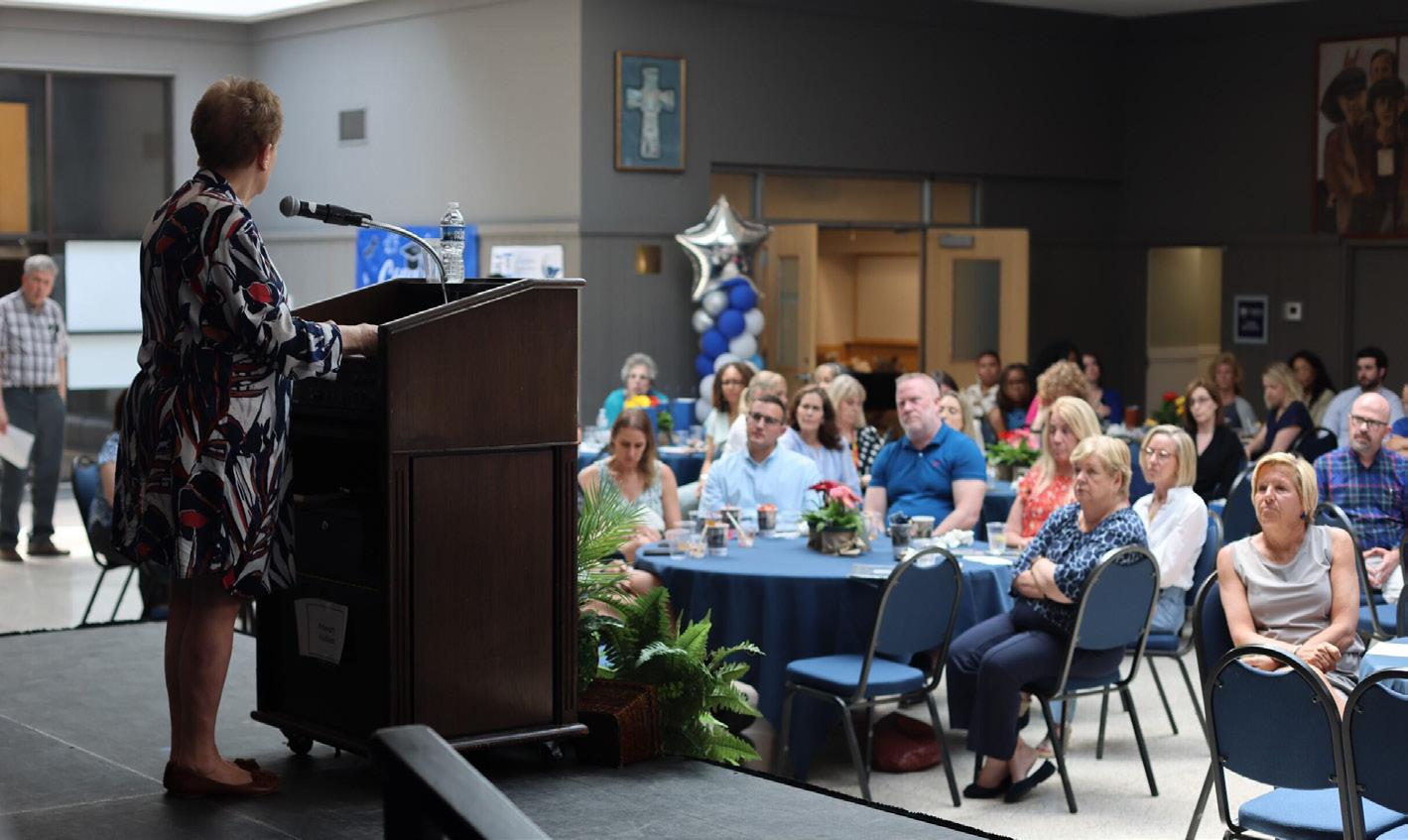 Once the cocktail hour ended, everyone made their way to the gym for the main event with food, drinks, and great conversation. After the speeches, there were many tears.