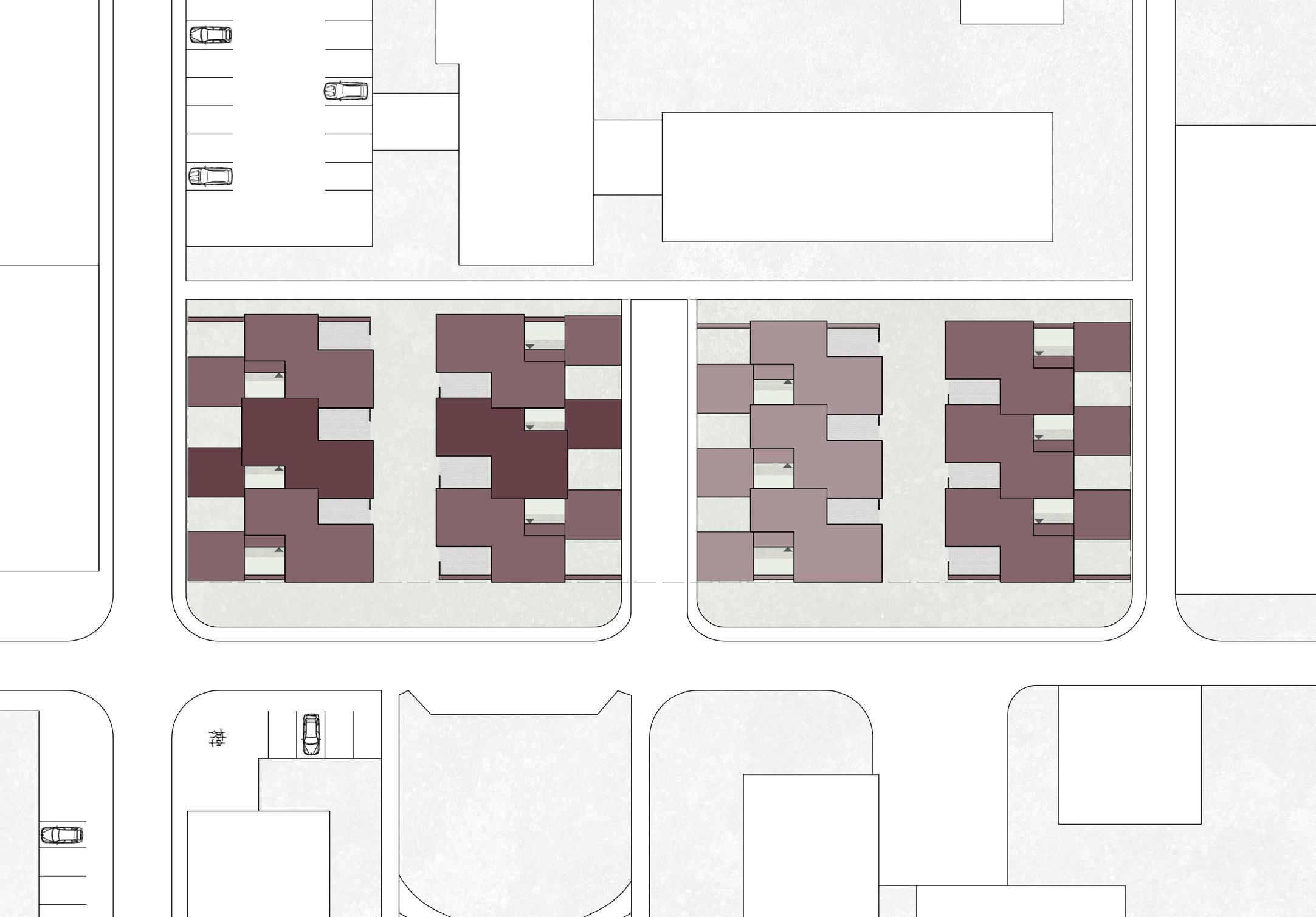 Radhusen är disponerade i fyra längor och är orienterade på ett sätt som ger gynnsamma solförhållanden till samtliga hus. De yttersta längorna nås via befintliga vägar medan en ny väg mitt i tomten leder till de övriga två. Husen finns i tre storlekar som illustreras i olika färger på situationsplanen. De mest ljusa representerar de minsta husen på 124 kvm BTA. Mellanvarianten ligger på 140 kvm BTA medan de mörkaste och största husen är på 163 kvm BTA.