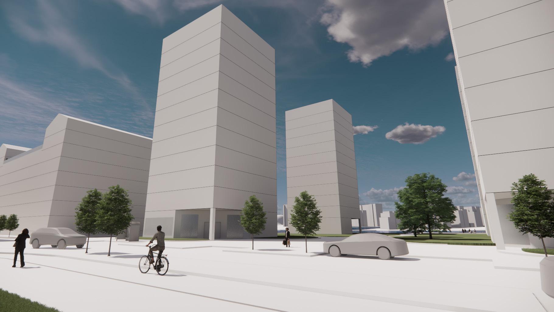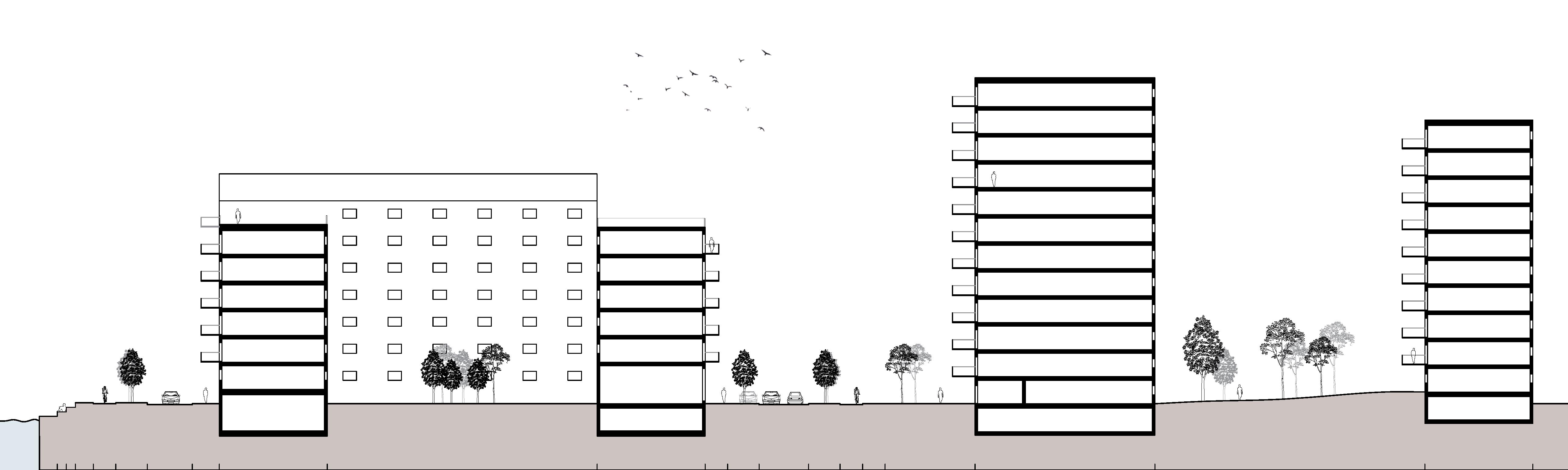 En blandning av olika byggnadstyper är tänkt att skapa en dynamik i stadslinjen samt främja mångfalden i området. De flesta byggnaderna är bostäder i form av lamellhus, kvartershus eller punkthus. De rundade lamellhusen är formade och orienterade på ett sätt som främjar utsikten mot älven och skapar en omfamnande känsla på torget. Kvarterhusen har för funktion att skapa mer privata och lugnare miljöer genom sina innegårdar i kontrast med punkthusen som ligger mitt i det offentliga. De långa lamellhusen längs boulevarden rymmer både kontor och bostäder.