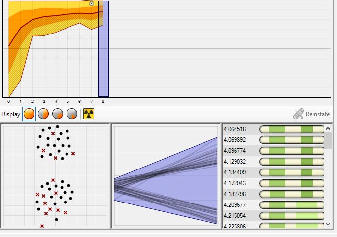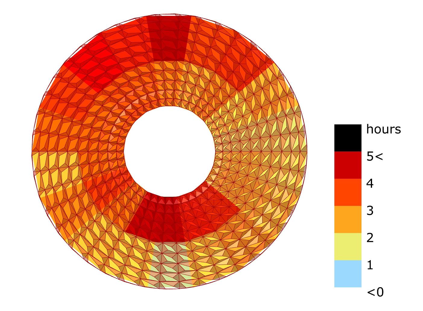Soltimmar efter optimering. Optimering med hjälp av Galapagosförsök att minimera arean som hamnar i direktsol genom att flytta på punkten som representerar solen. Detta gör att man sedan kan hitta en bättre orientering av taket.