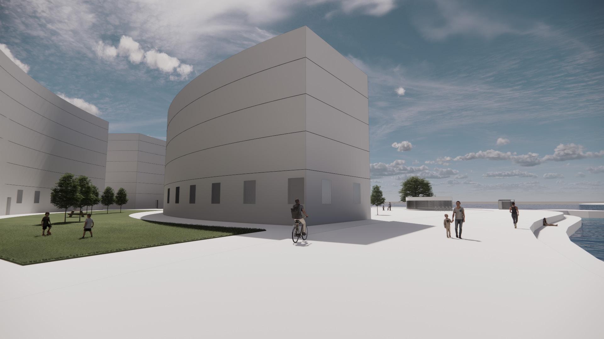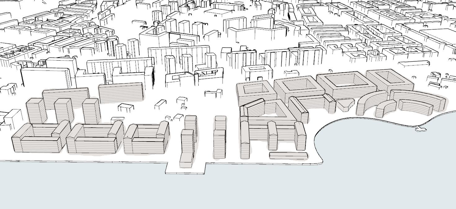 De krökta byggnaderna och strandpromenaden med det hårdgjorda torget i bakgrunden.
