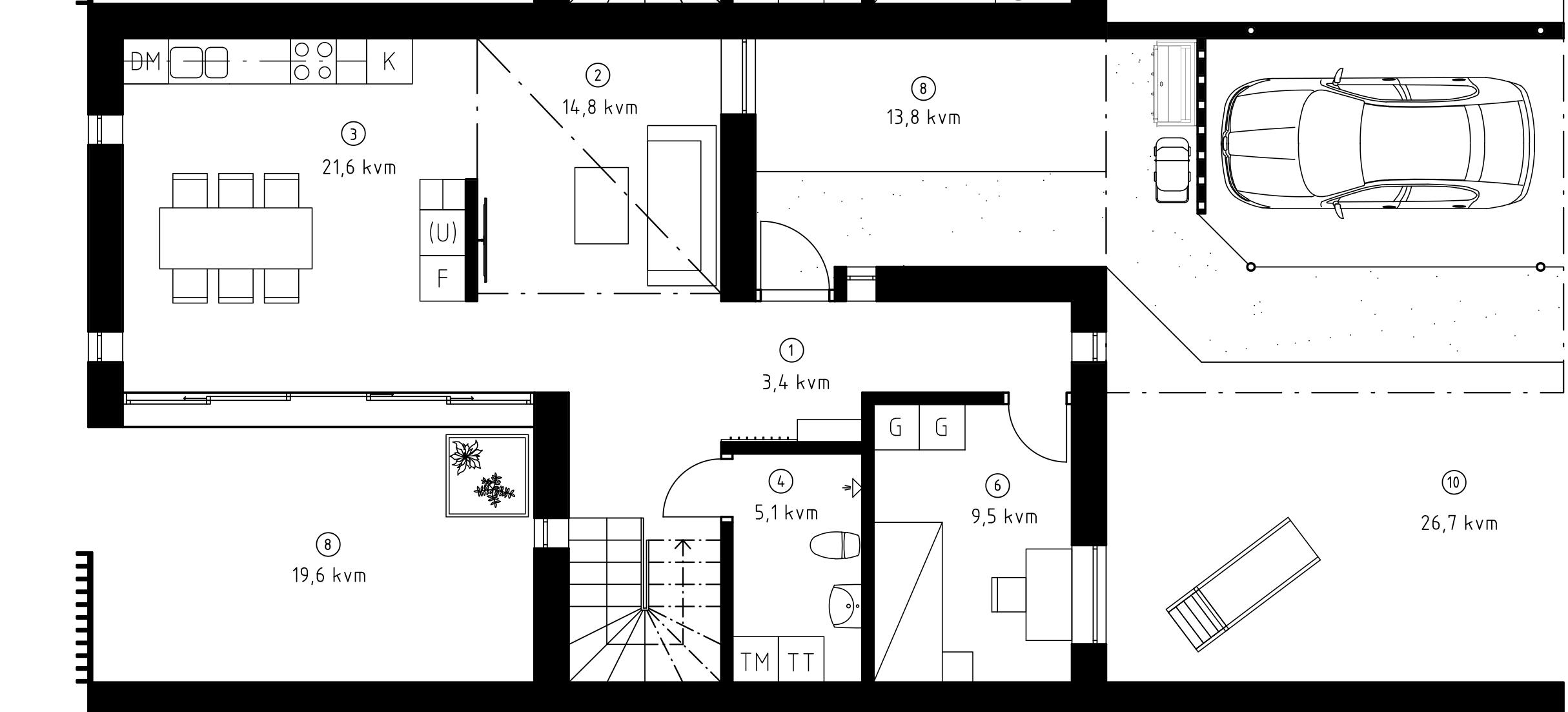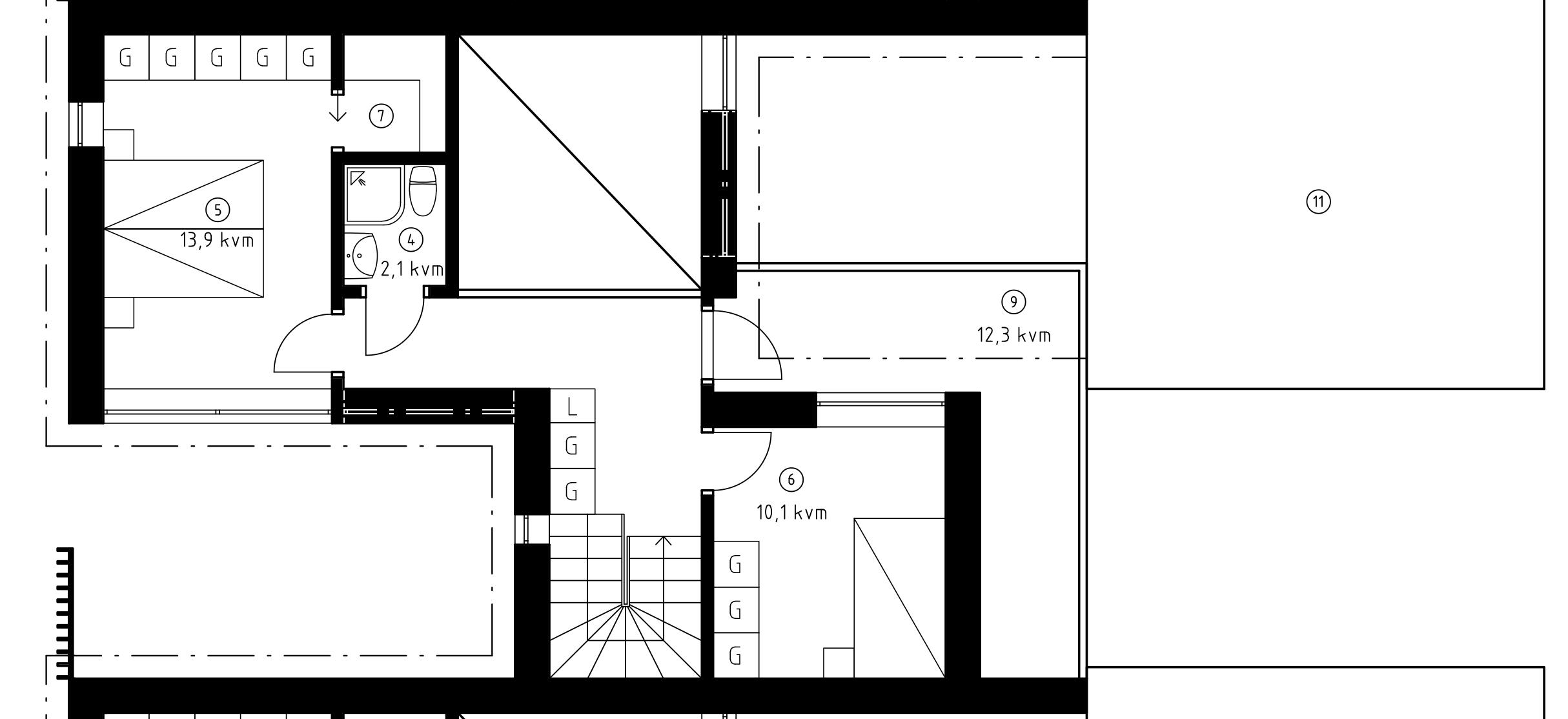 Planen som illustreras här gäller för mellanvarianten. Bottenplanen är densamma för alla tre storlekarna. Hos de mindre husen finns inget flexrum på övervåningen och detta kompenseras med en större terrass. De större husen har ett extra flexrum på övervåningen men ingen terrass.