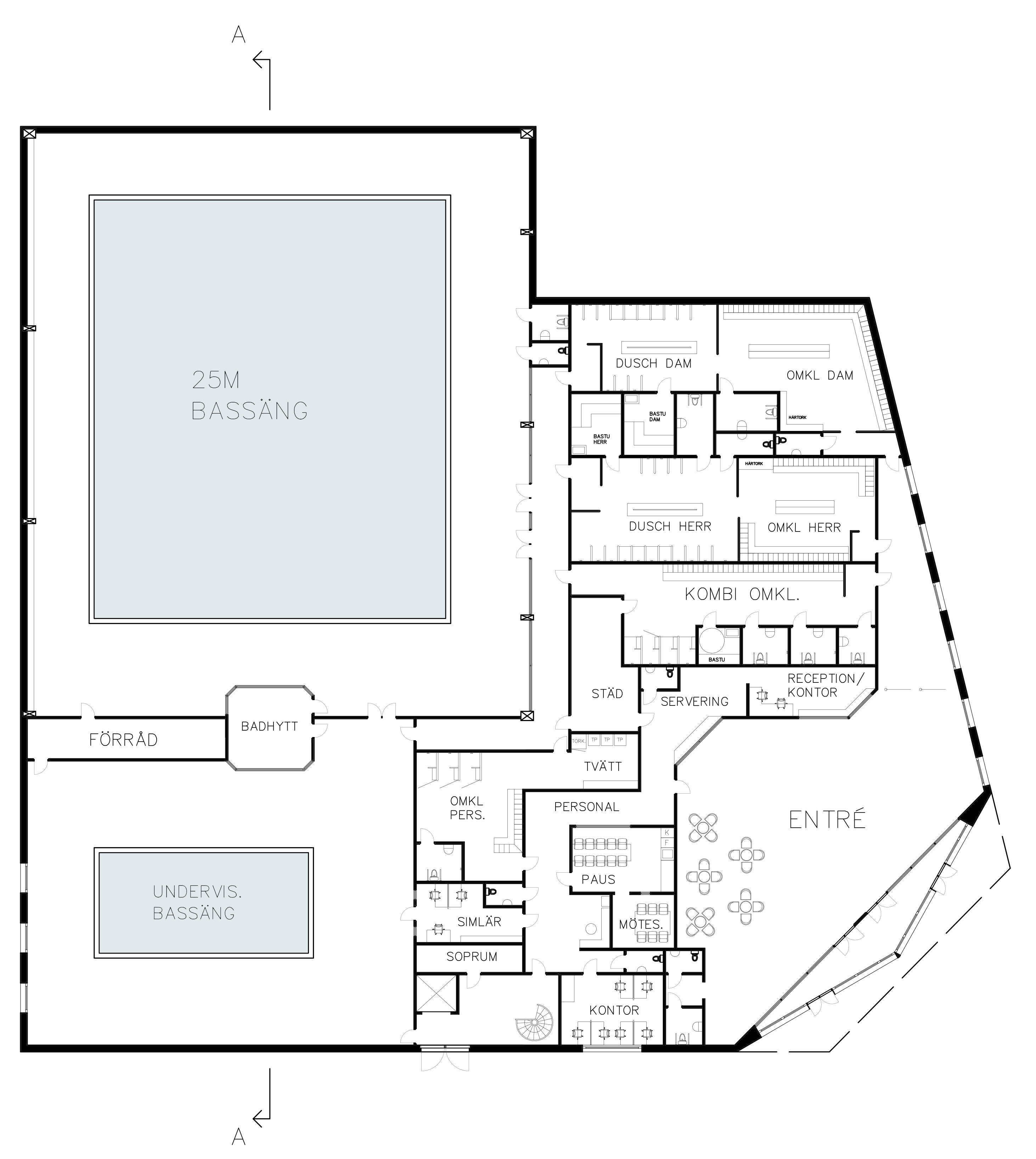 Byggnadens form är anpassad till tomten och är tänkt att underlätta för besökarna att komma till entrén, oavsett om de anländer med kollektivtrafik, cykel eller bil. Där hittar de en mindre serveringsplats samt reception och erbjuds tre olika omklädningsrum att välja emellandam, herr och kombi (individuella bås/dusch). De leds sedan in i de två bassängrummen via ett badgalleri.