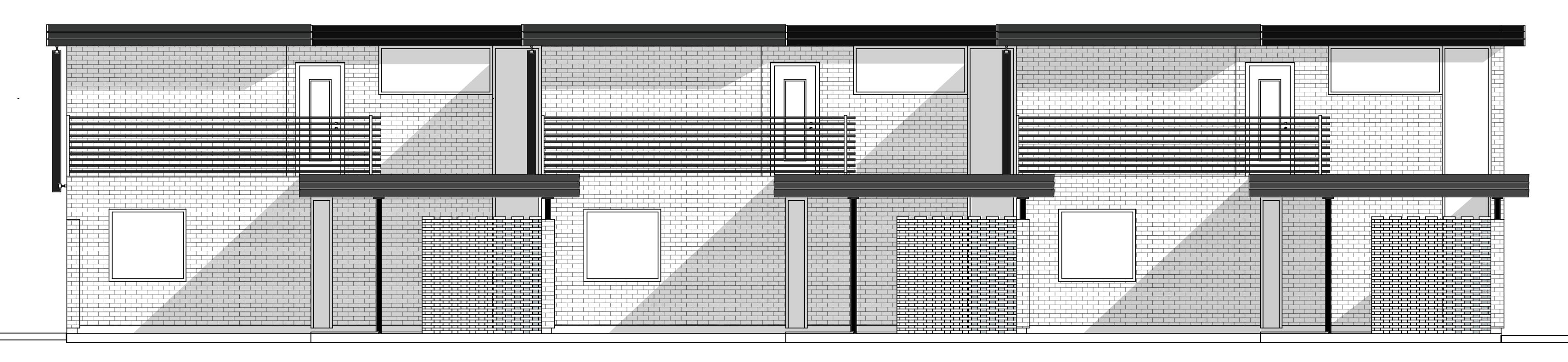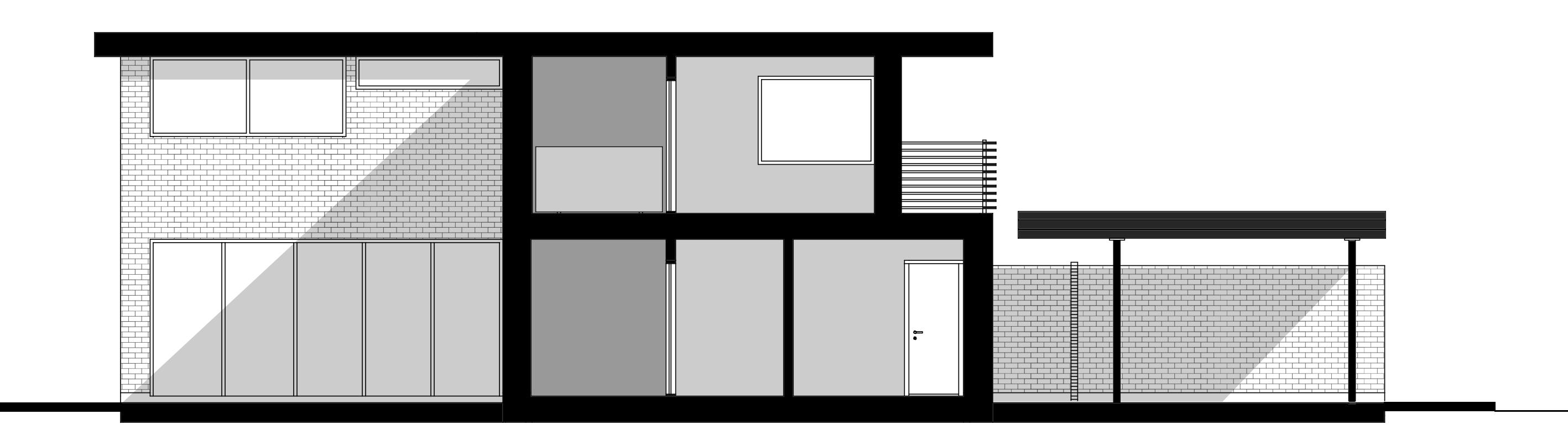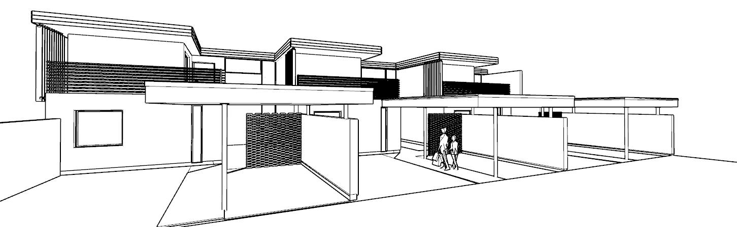 Vägen in i radhuset är en rumsekvens som progressivt leder de boende från det offentliga gaturummet till den privata bostaden via en gångväg under carportstaket och en atriumgård.