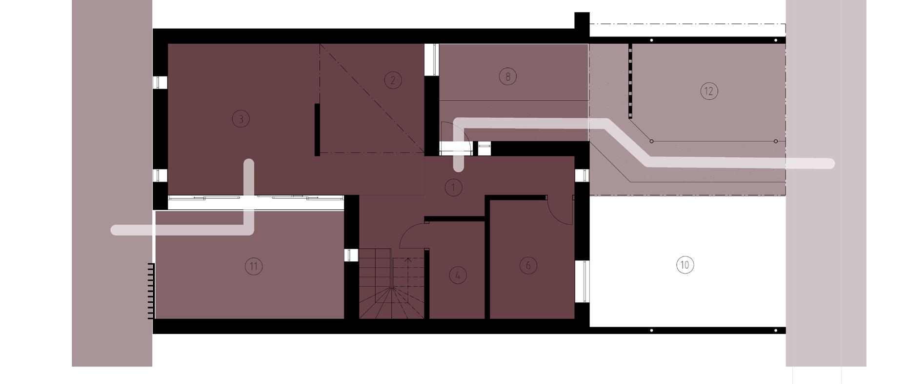 Entrén tillsammans med hallen kopplar ihop de två rektanglarna i planen: den mer privata delen och de mer sociala utrymmena. Denna koppling förstärks av axialiteten i korridoren som på samma sätt blir en länk mellan den privata och den gemensamma trädgården. Även där finns den progressiva transitionen mellan privat och offentligt då en går från köket till ett halvprivat atrium för att ta sig till den gemensamma trädgården.