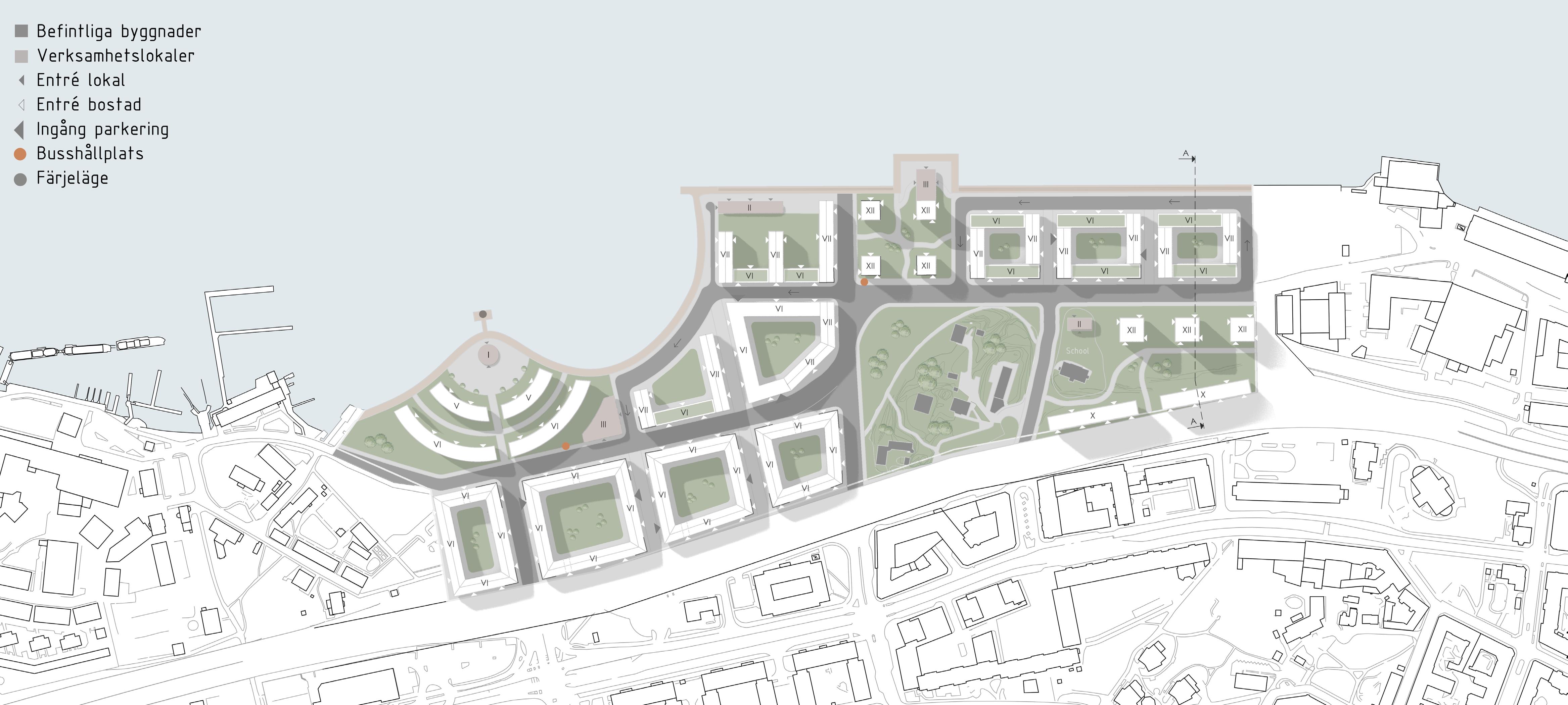 Siktlinjer mot Eriksberg och anslutningar till Majorna skapar ett ramverk i planen för bebyggelsen och styr flöden i området.
