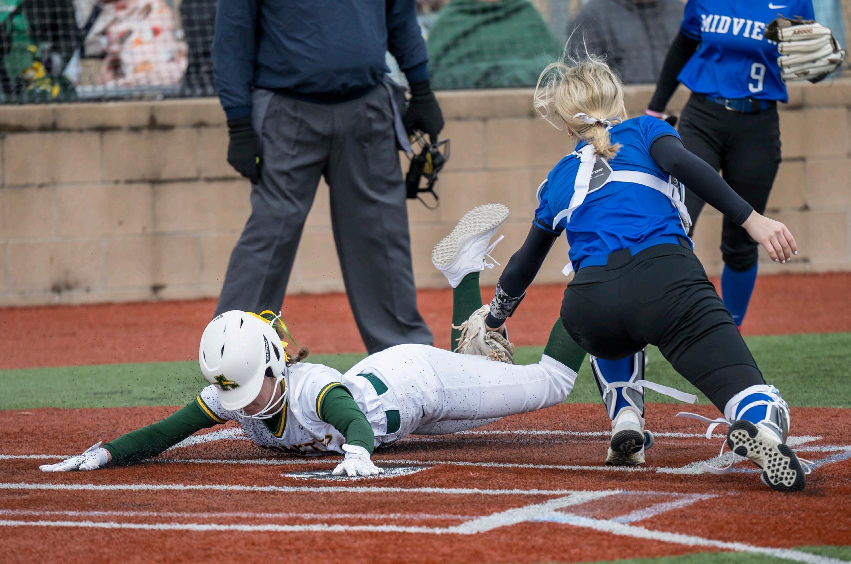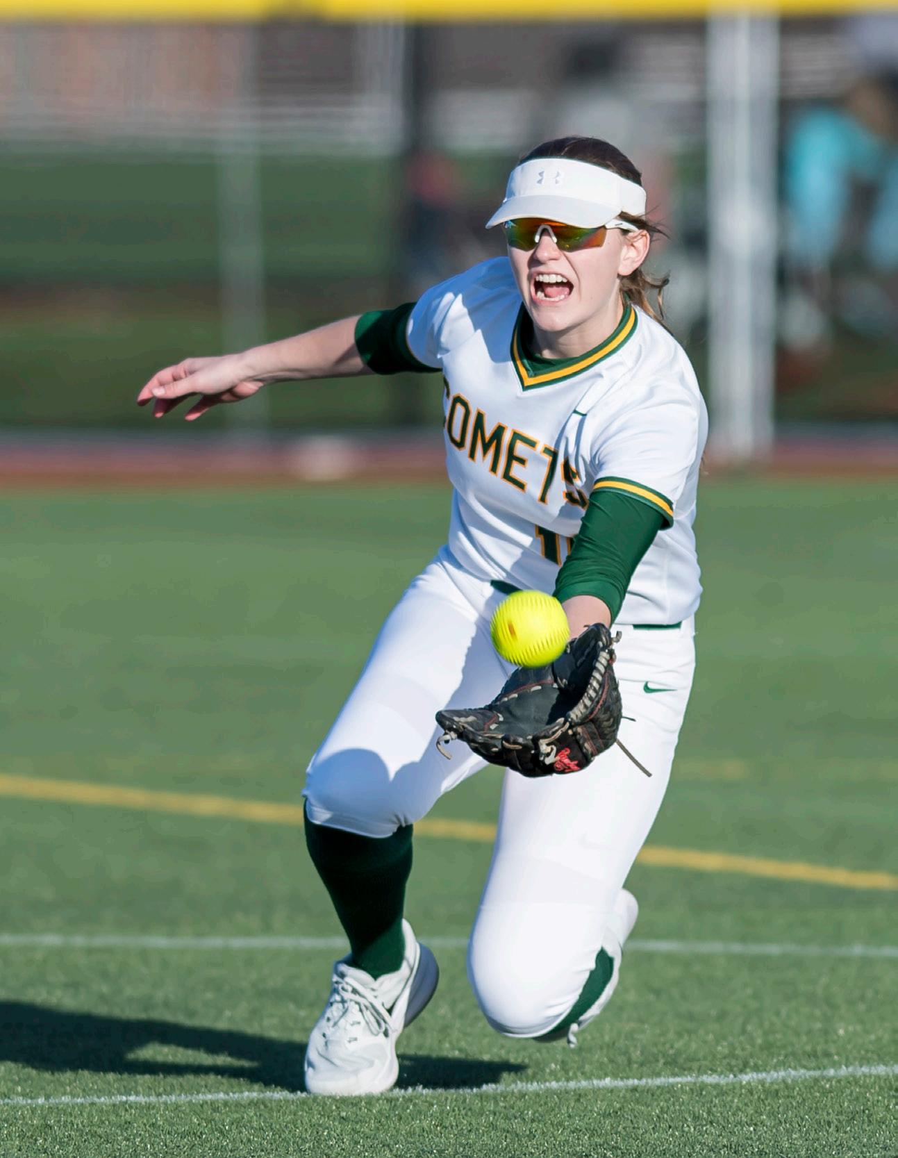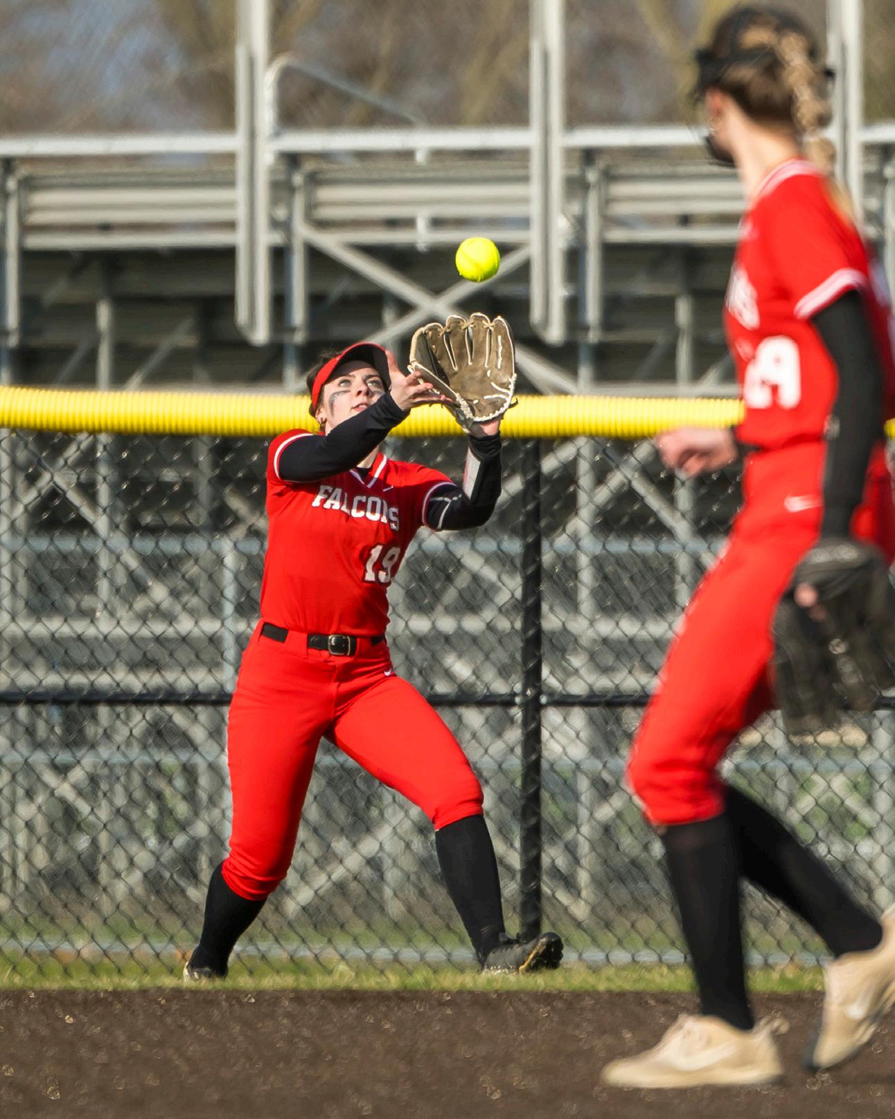 Firelands’ Kayla Aslaksen makes the catch in center field at Clearview as Paige Coggins looks on.