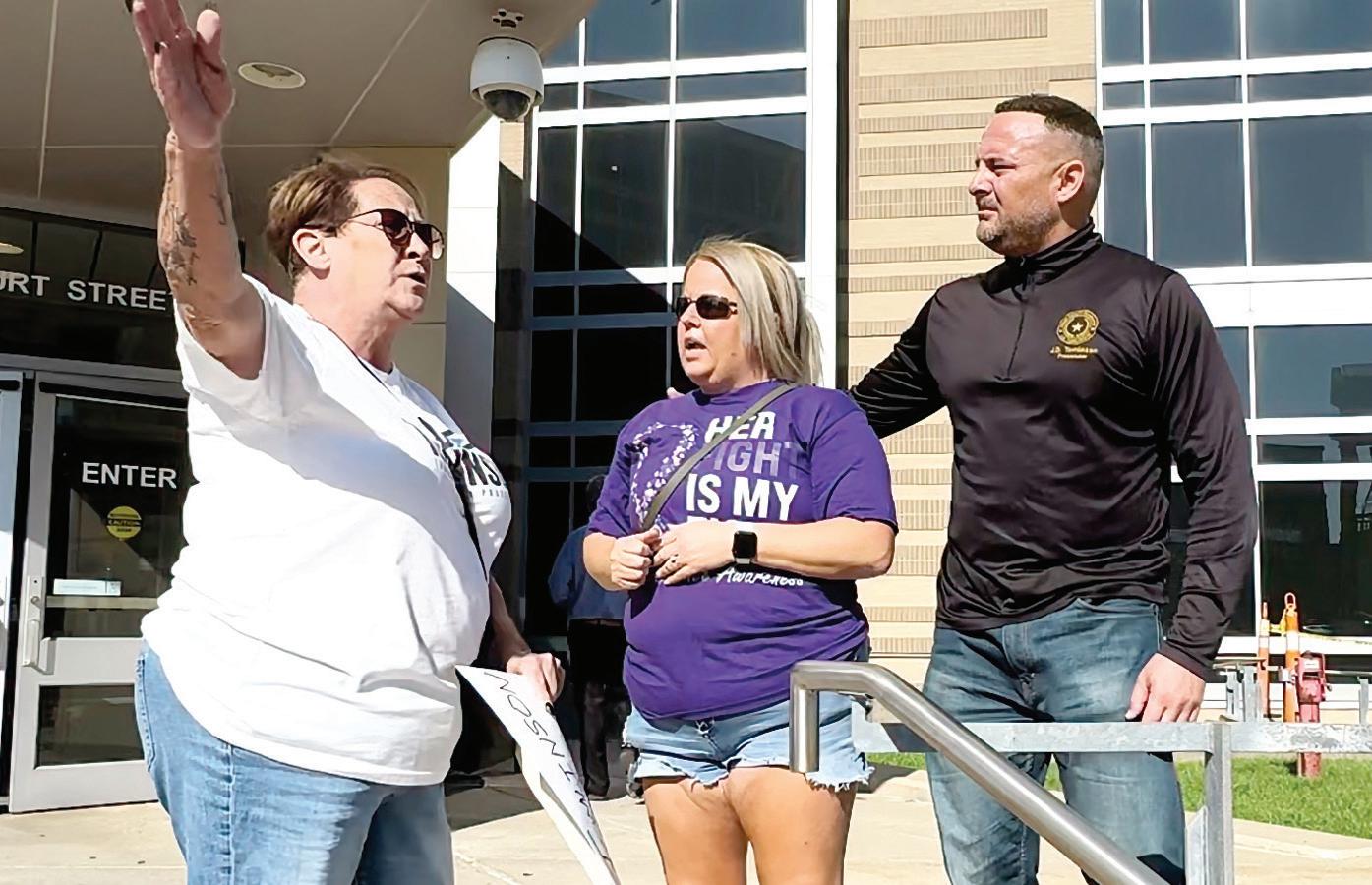 From left, J.D. Tomlinson supporter Nancy Smith; Tia Hilton, who represents a group rallying for survivors of domestic violence; and Prosecutor J.D. Tomlinson argue Monday outside the Lorain County Justice Center, where Tomlinson was facing accusations from the rally group. To see video, scan the QR code below.