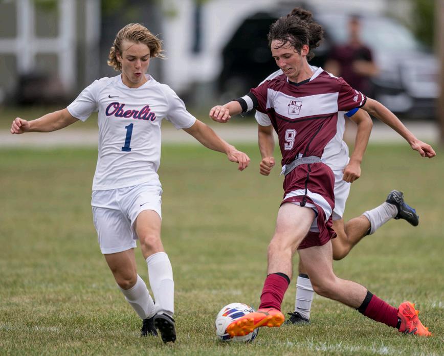 At right, Wellington’s Spencer Brasee cuts the ball back against Oberlin’s Luke Peterson.