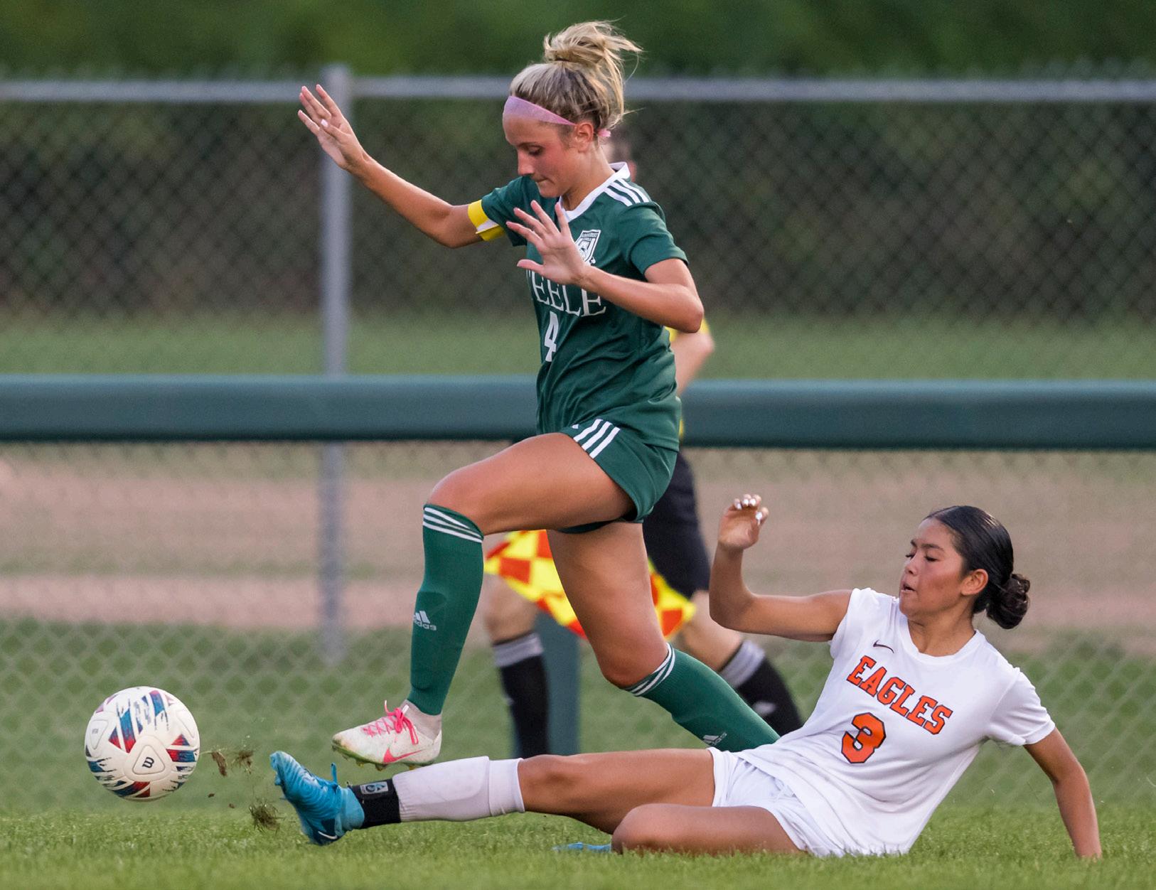 At right, Wellington’s Lucy Roush battles for the ball with Oberlin’s Melody Cyrus.