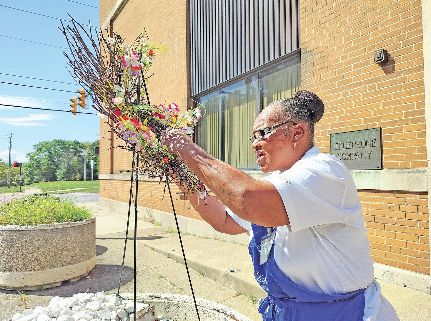ELYRIA — The sun beat down on Sandra Hill-Ross as she zip-tied a small floral wreath to a metal holder alongside Third Street.