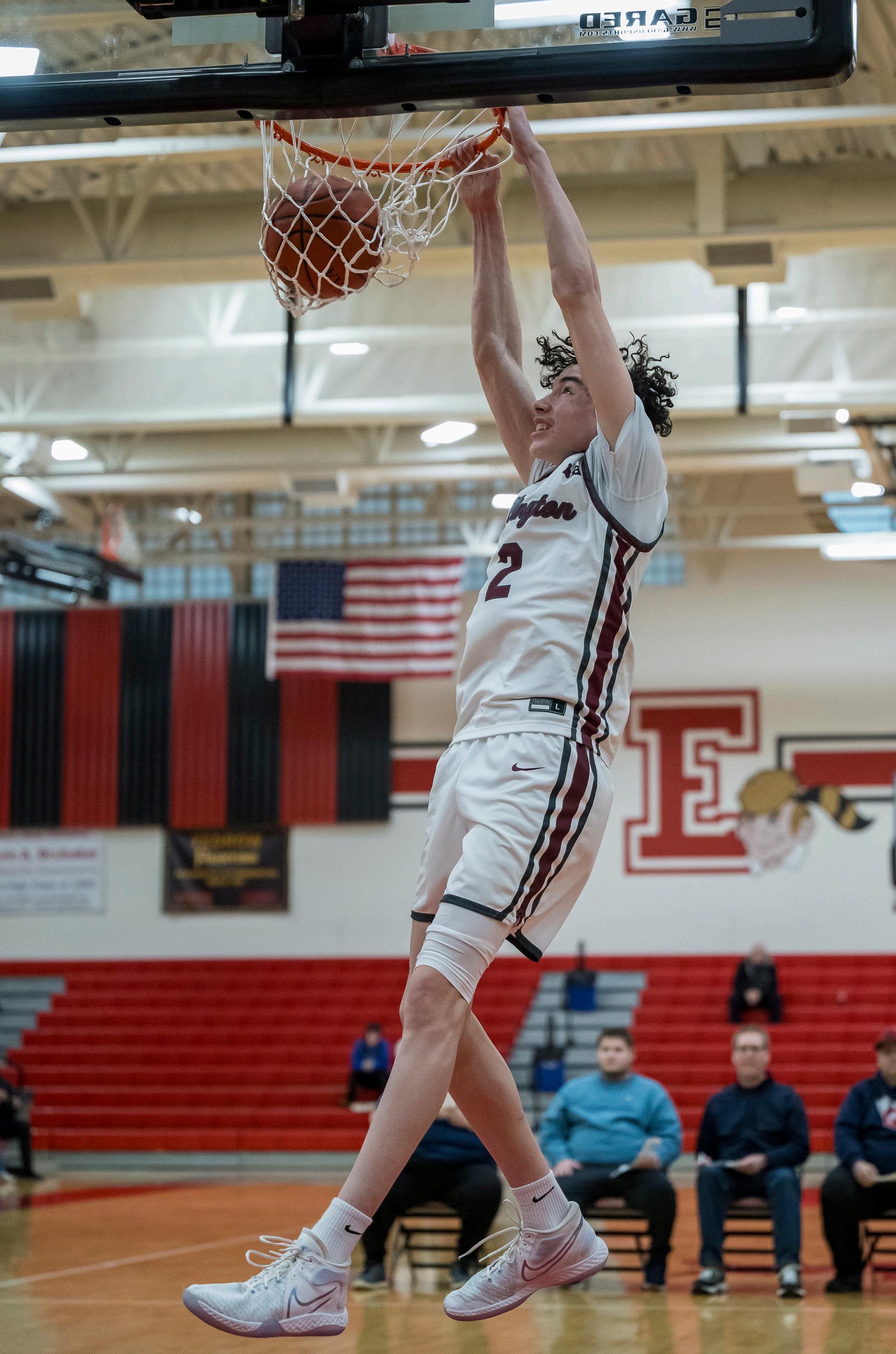 The 2024 Lorain County Division III Basketball Player of the Year, Sean Whitehouse, of Wellington, completes a dunk in the Slam Dunk competition.