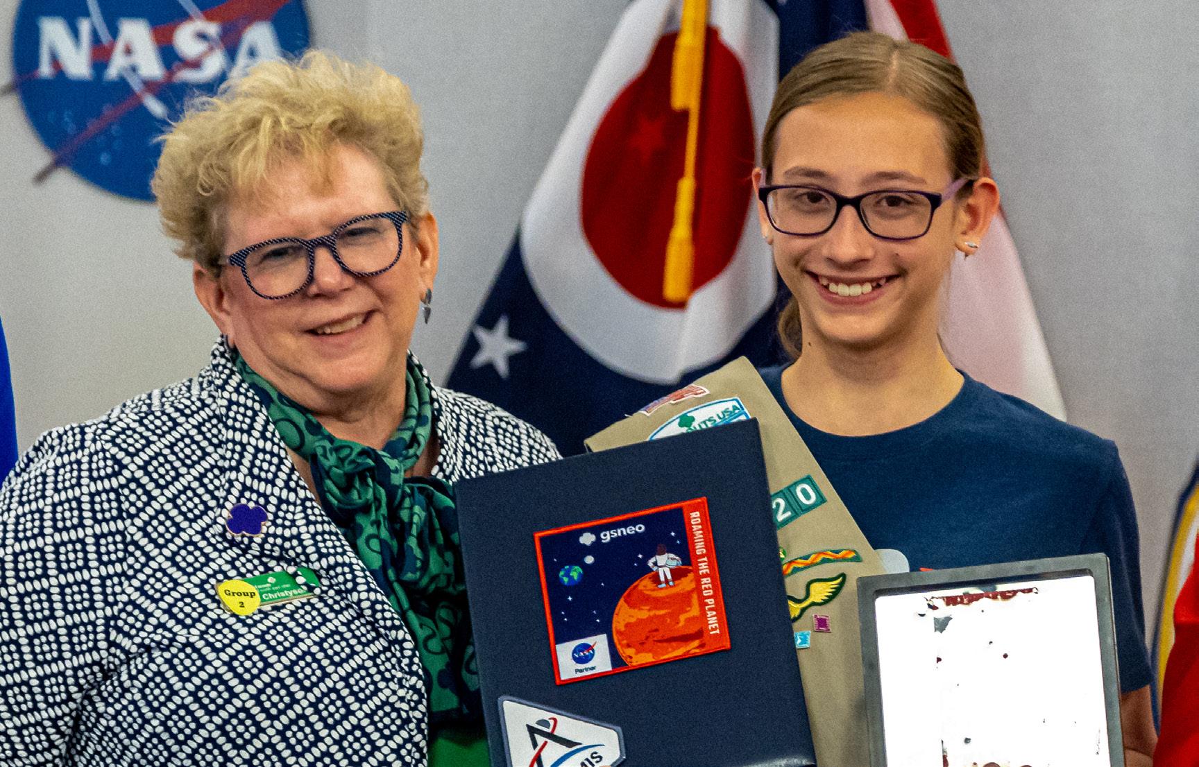 The Community Guide Girl Scout, Clara Walsh, 12, of Avon with the CEO of the Girl Scouts of NorthEast Ohio, Jane Christyson, after being presented a badge as a award for winning an essay competition during a ceremony at the NASA Research Center in Cleveland on Thursday, May 4.