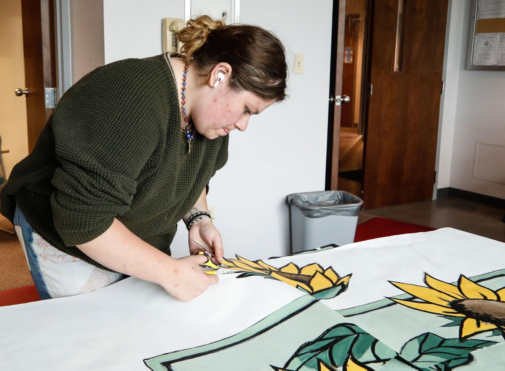 LEFT: Oberlin College freshman Kali Bateman cuts out sunflowers to place on a mural in the stairwell at Oberlin Community Services.