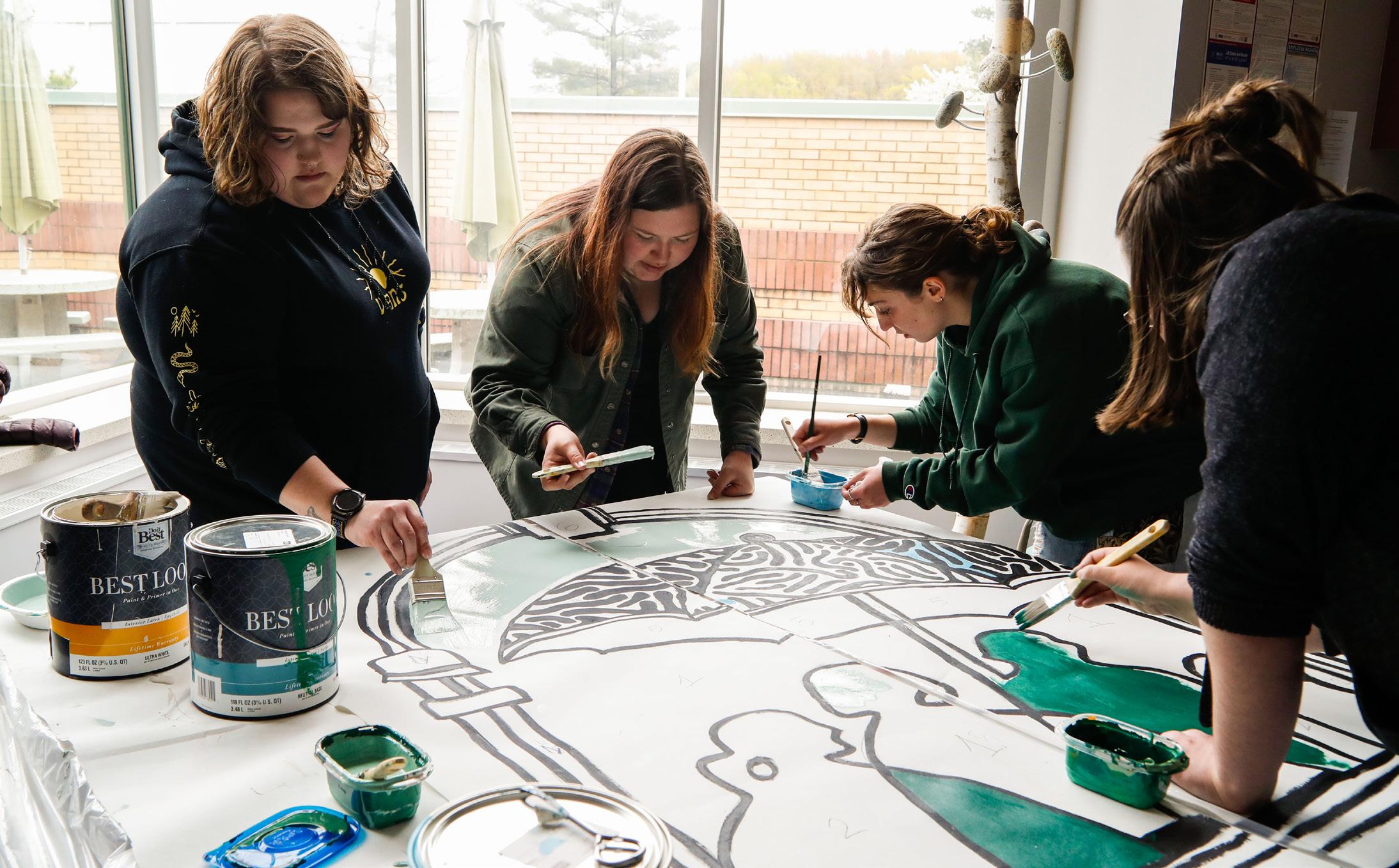 TOP: From left, Mikayla Thompson, Garden Associate at OCS; Jenna Stolarik, OCS Guardian Coordinator; Derya Taspinar, a sophomore at Oberlin College; and Sam Donohue, OCS Media and Outreach intern, paint a piece of the mural for the stairwell at Oberlin Community Services’ new East Lorain Street building.