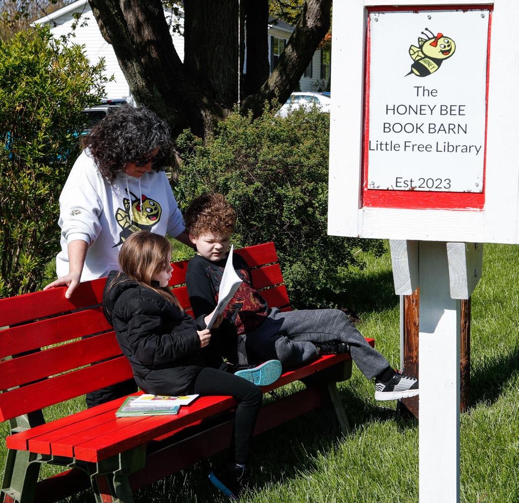 Johnna Lyman, an intervention specialist at Lorain’s Toni Morrison Elementary School, helps first graders Mya Ellison, 8, and Vincent Fahrney, 7, read a book from the Honey Bee Book Barn on Thursday, May 4, 2023.