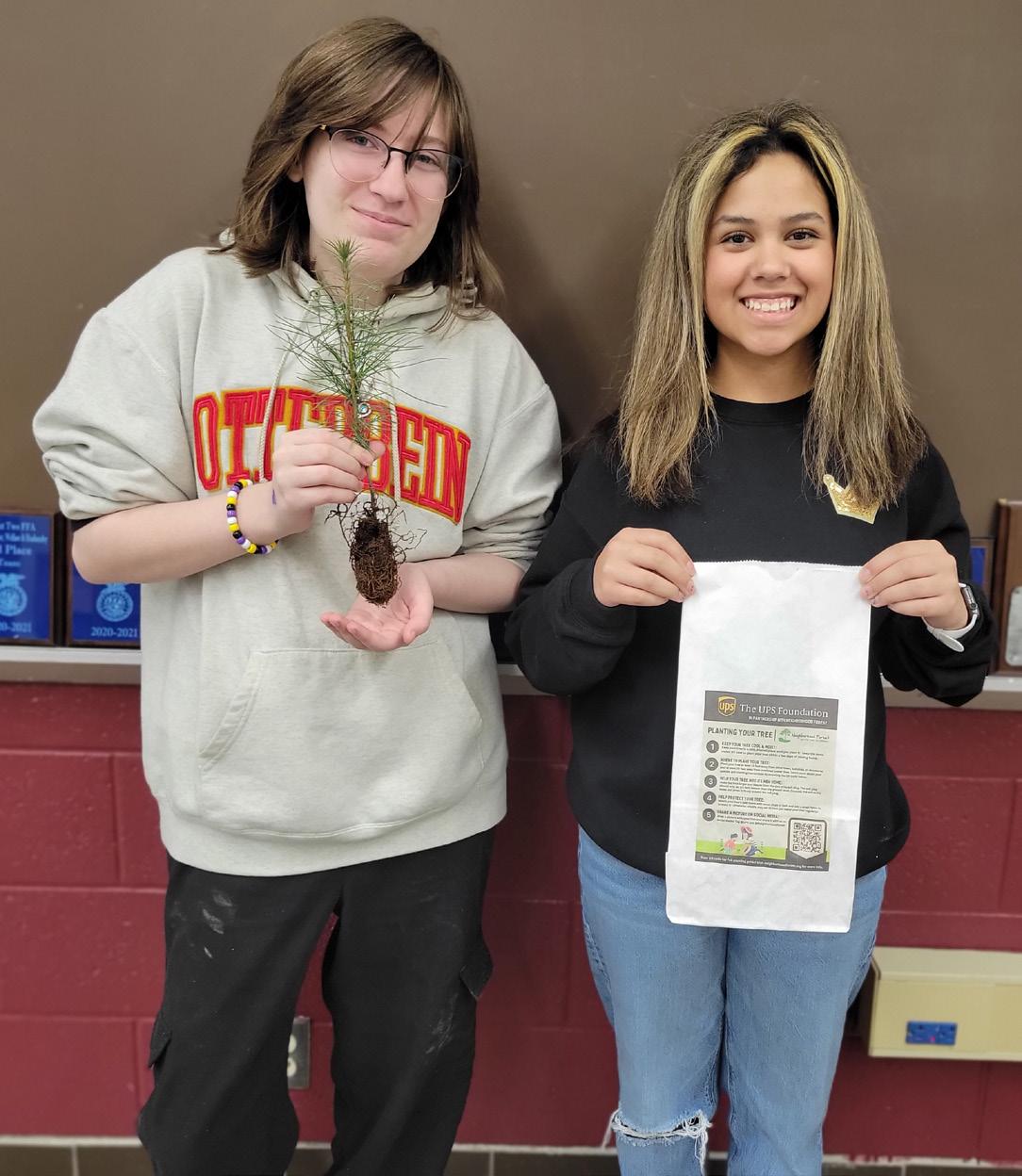 From left, FFA members and seniors Lillian Mull and Madison Minutello pose while helping pass out trees to classmates at Wellington Schools.