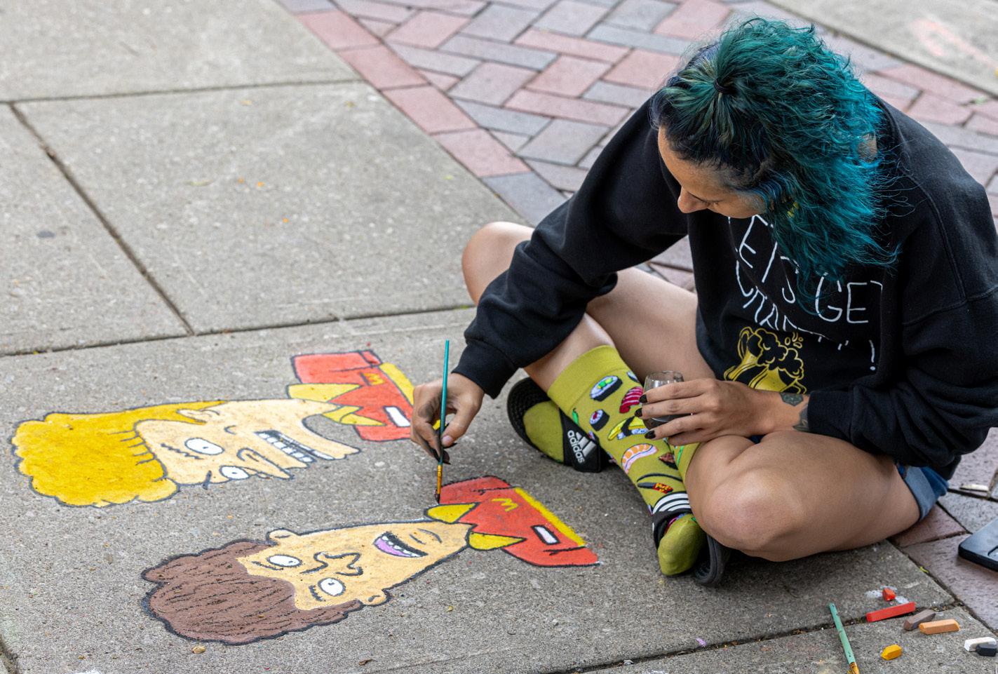BELOW: Candace Traster designs her chalk art of Beavis and Butt-Head.