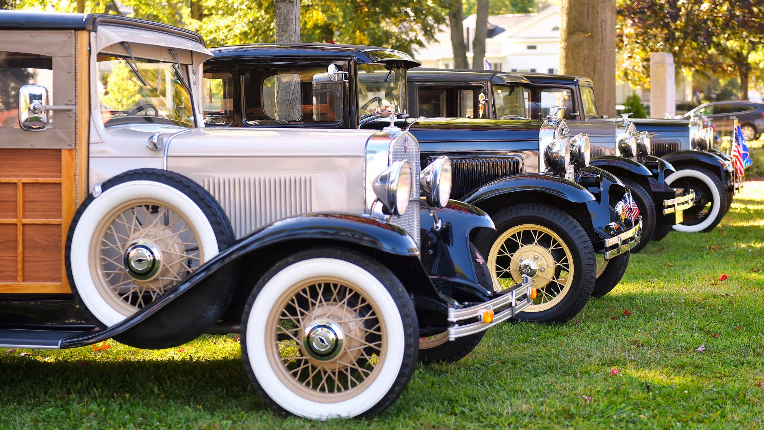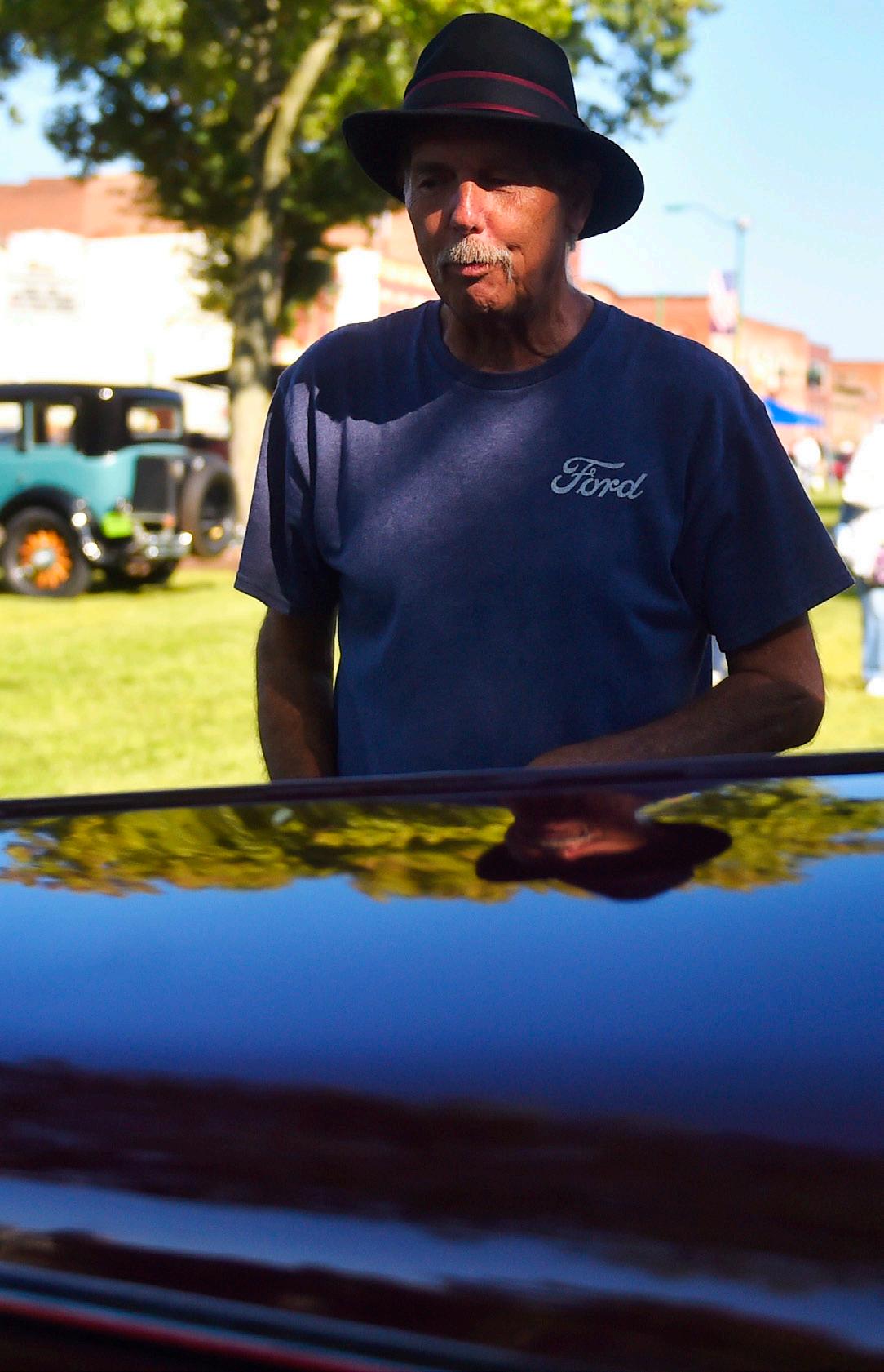 ABOVE: Jim Hanobik, of North Olmsted, viewed several of the antique cars parked on the square on at the Wellington home tour and antique transportation show.