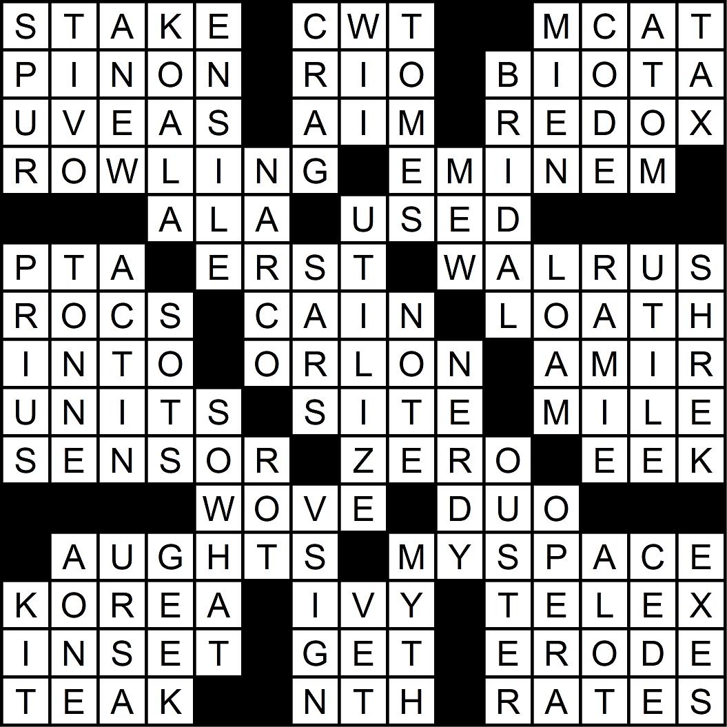 ACROSS 1. Interest in a venture 6. Hundredweight, acr. 9. Med. sch. requirement 13. ____ the tail ___ the donkey 14. Duran Duran’s 1982 hit 15. All plants and animals 16. Part of an eye, pl. 17. Go for the bull’s eye 18. Reduction/oxidation portmanteau 19. *Best selling author of the 2000s 21. *Billboard’s music artist of the 2000s 23. Chicken ____ ____ king 24. From a thrift store 25. Class-conscious grp. 28. Formerly, once 30. Marine mammal in famous Beatles’ song 35. Fabled fliers 37. Jealous biblical brother 39. Averse 40. *”He’s Just Not That ____ You” (2009) 41. Acrylic fiber 43. Arabian chieftain