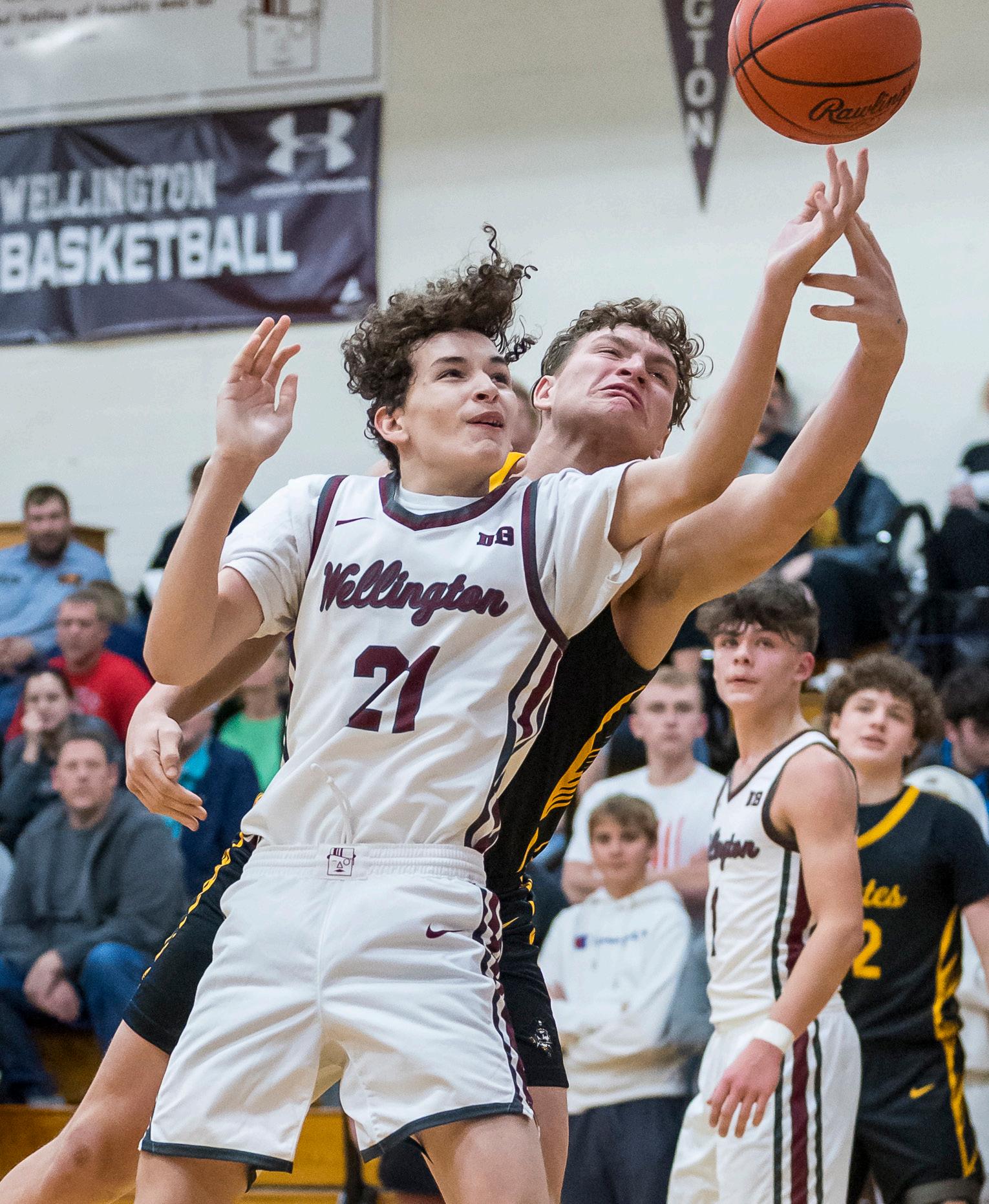 The Pirates’ Cayden Hinderman and the Dukes’ Sean Whitehouse each had a 22-point night when the neighboring Lorain County League rivals met last week, but otherwise the game was lopsided. With a 19-0 first period, Black River had the win in the bag early and finished 71-44. The Pirates had a 17-point performance by Ridge Martin, with 12 more from Eric Groesser and 10 from Evan Ladina. Wellington had Whitehouse but not the backup — Deakan Wirth was the only other player to cross into double digits, with 11 points. LEFT: Black River's Blake Hopkins celebrates with Eric Groesser afer hits the final shot of the first half at Wellington. CENTER: Wellington's Landon Whitehouse and Black River's Chase McKenzie battle for a rebound.
